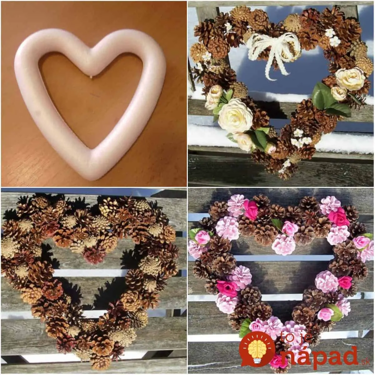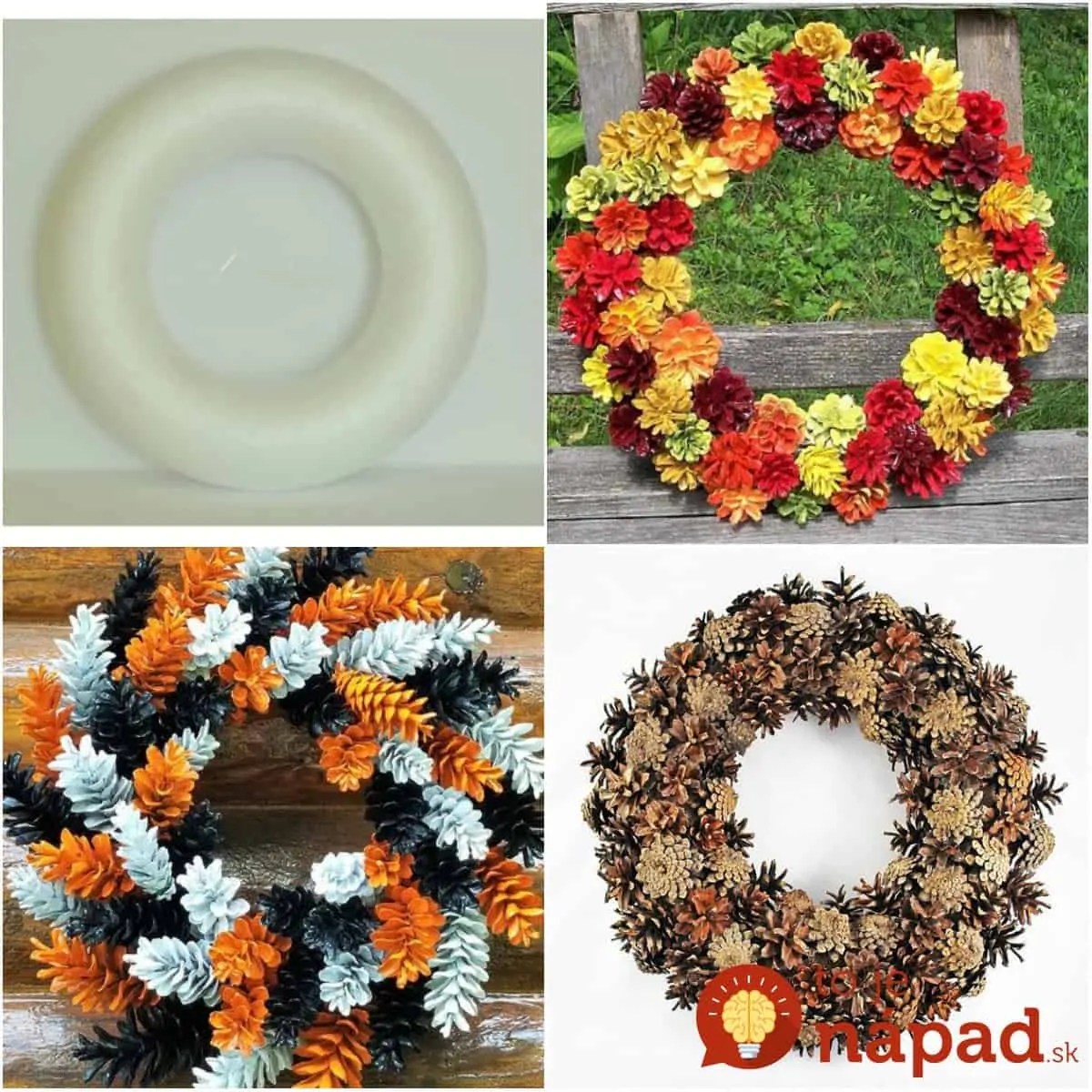 Ďalší spôsob ako si vytvoriť krásny šiškový veniec je ten, že budete šišky lepiť na polystyrénový podklad, ktorý kúpite v obchode za pár eur. Dostupné sú rôzne tvary a veľkosti.
