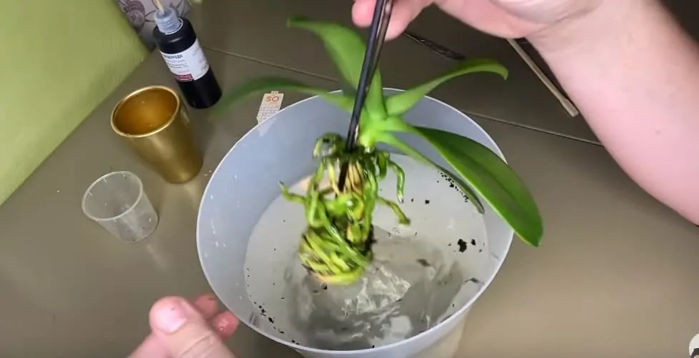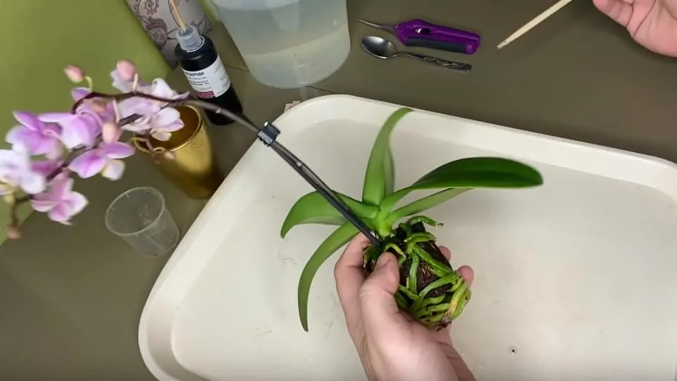 Aby sme si boli istí, že sme odstránili všetok substrát, rastlinu ešte vykúpeme vo vode.