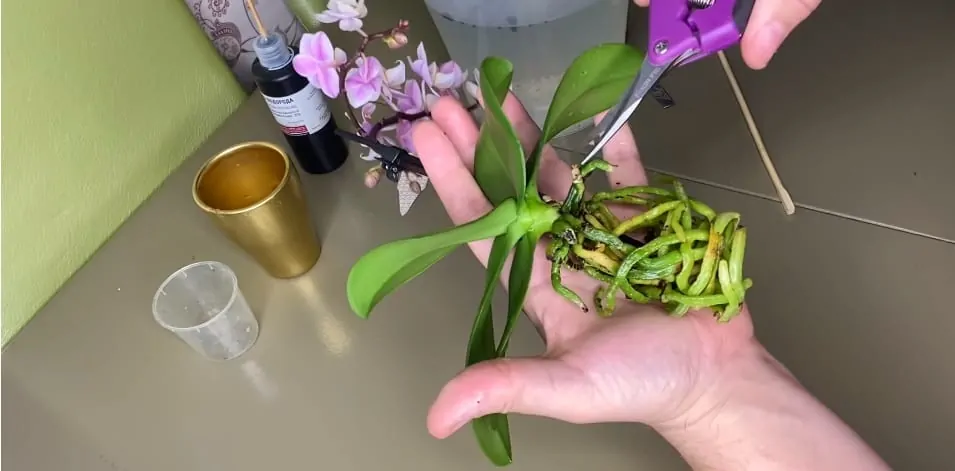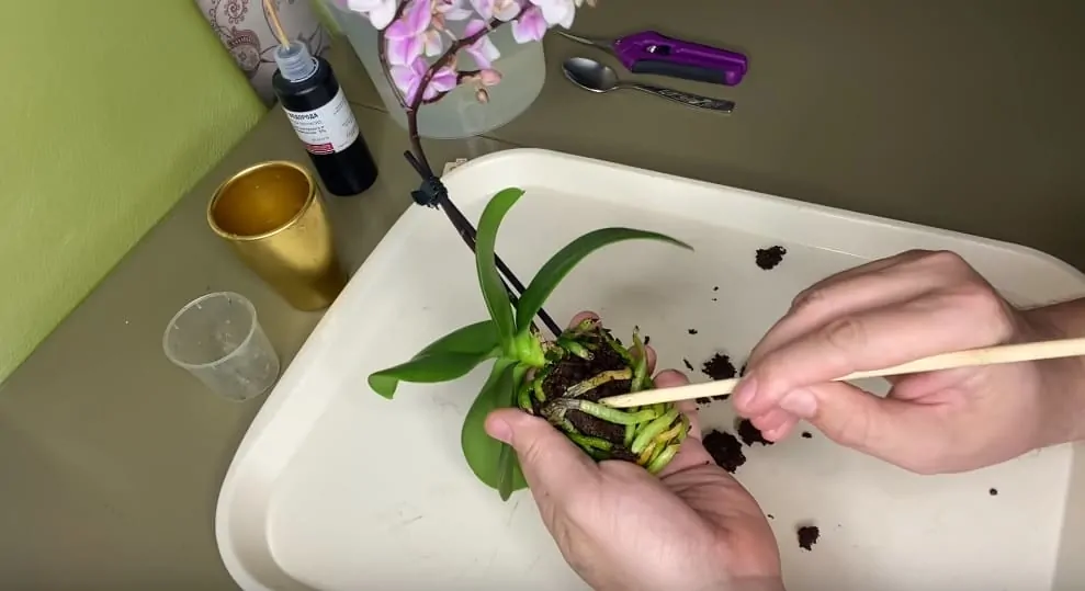 Ako prvé je potrebné rastlinu opatrne vybrať zo substrátu a jemne očistiť korene. Korene, ktorú sú zvädnuté, suché, alebo poškodené odstránime.