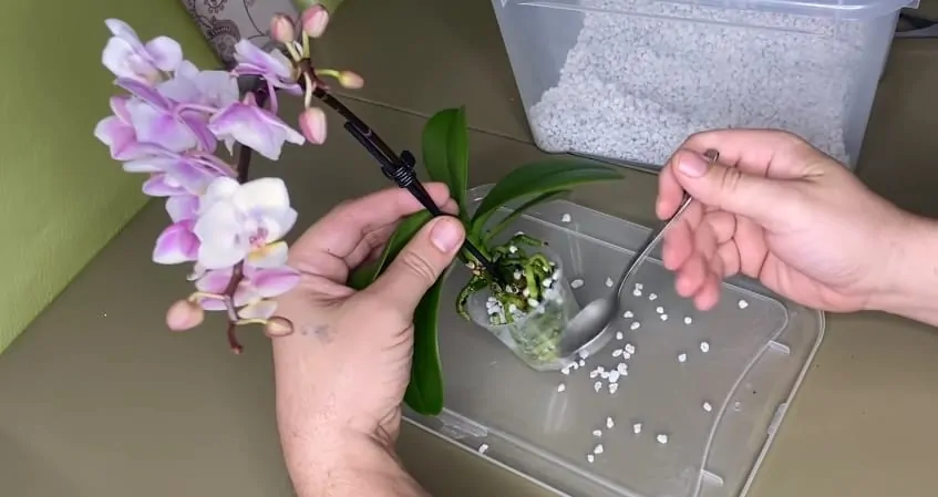 Teraz rastlinu posadíme do nádoby a pridávame perlit tak, aby nám orchidea pekne stála.