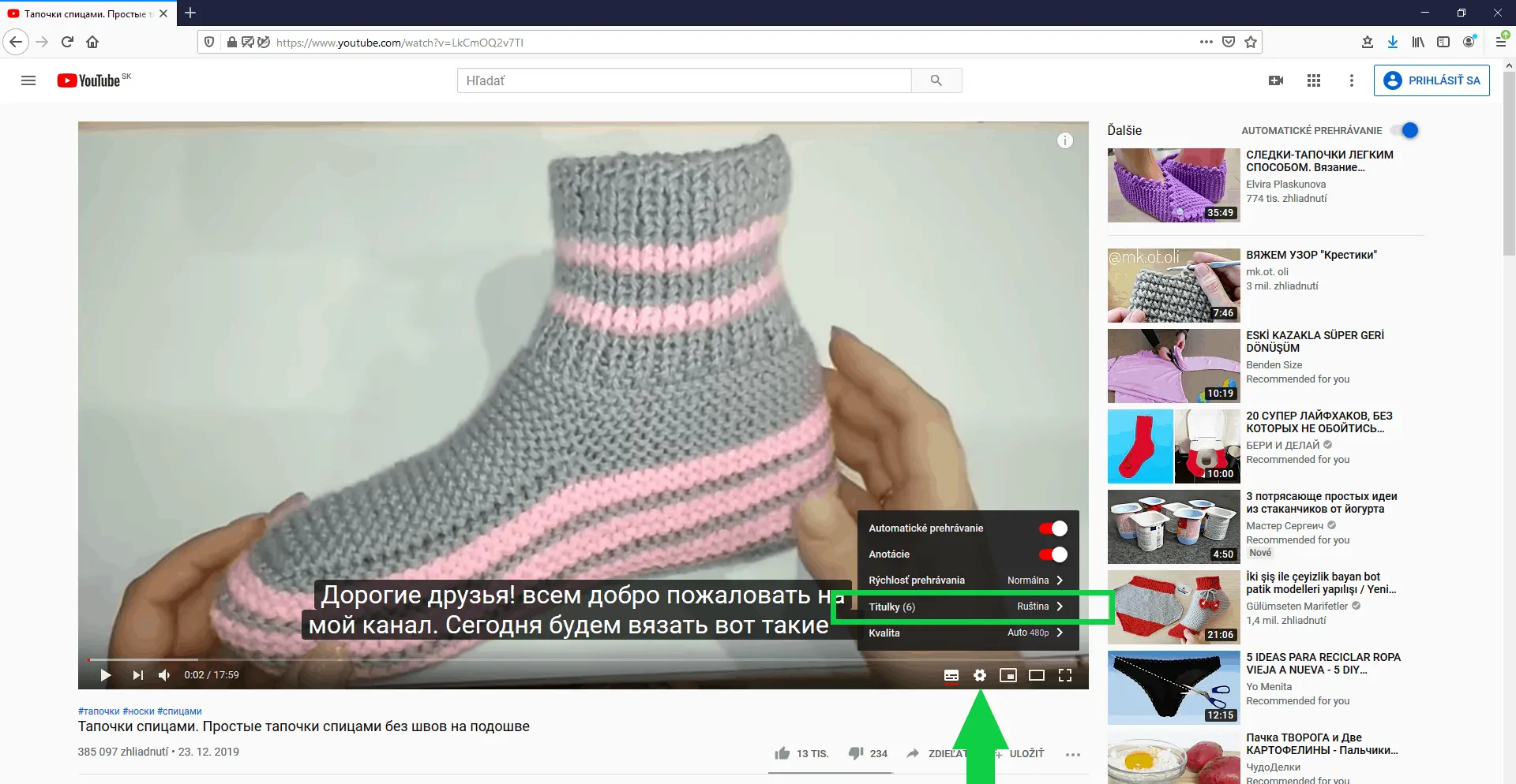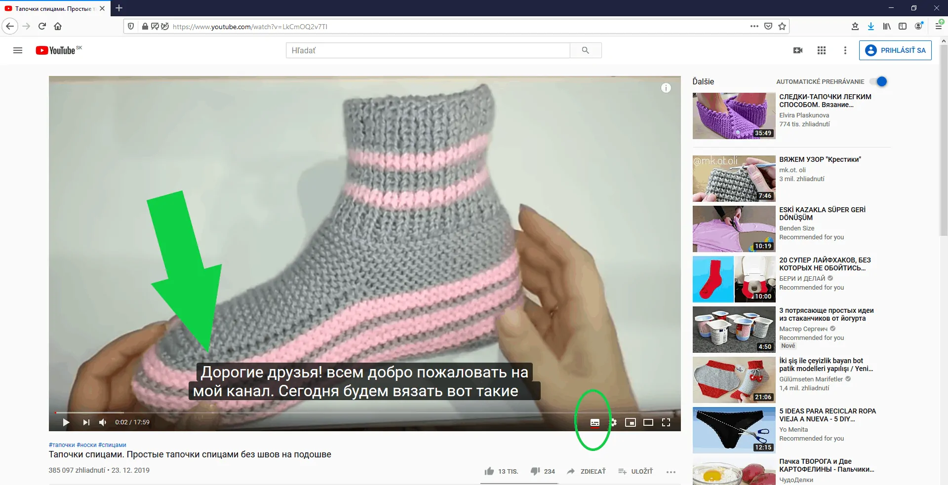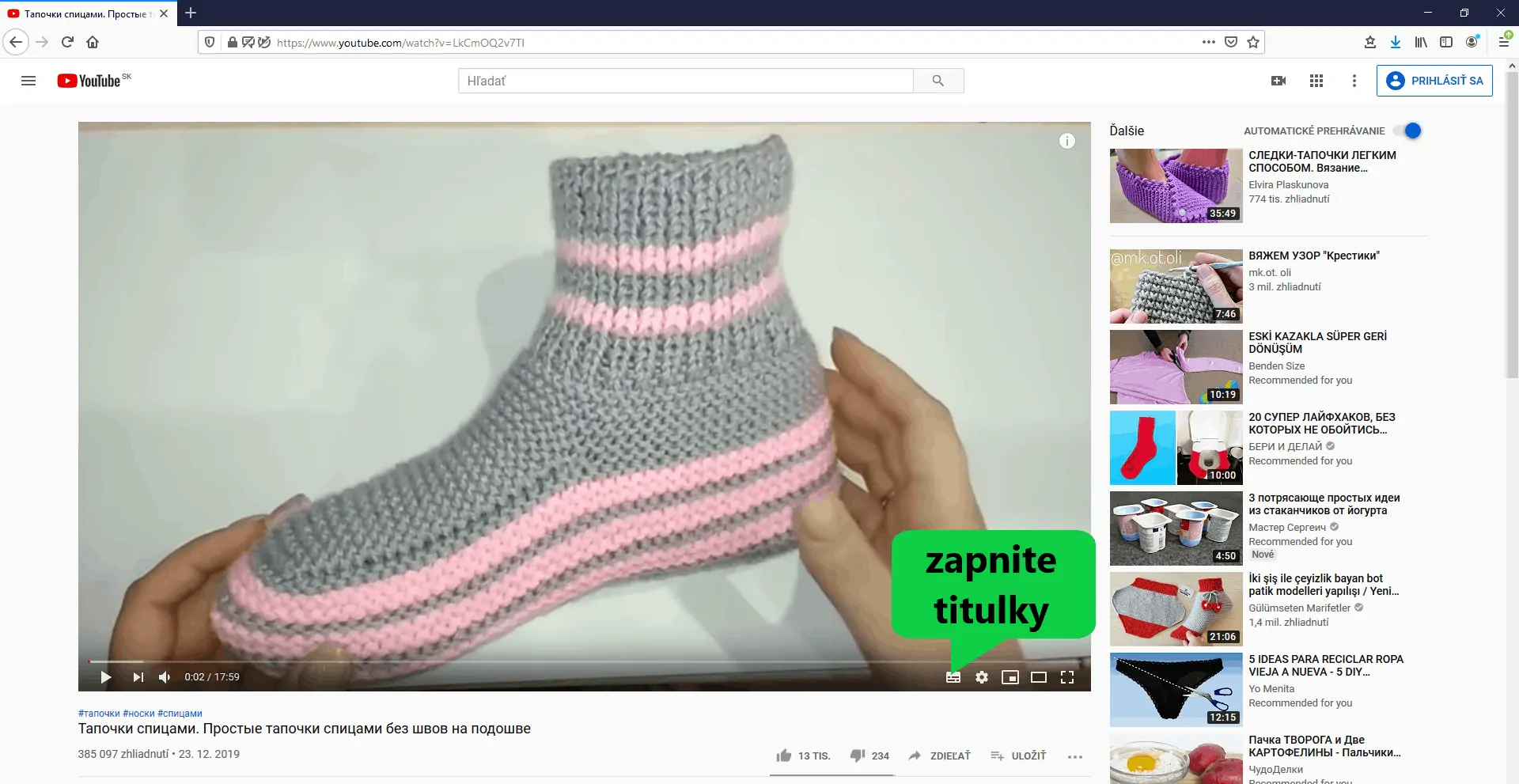 Vyhľadajte si video, ktoré vás zaujíma a zistite, či sú dostupné titulky v pôvodnom, alebo inom jazyku. Kliknite na ikonku na zapnutie titulkov (viď obrázok).
