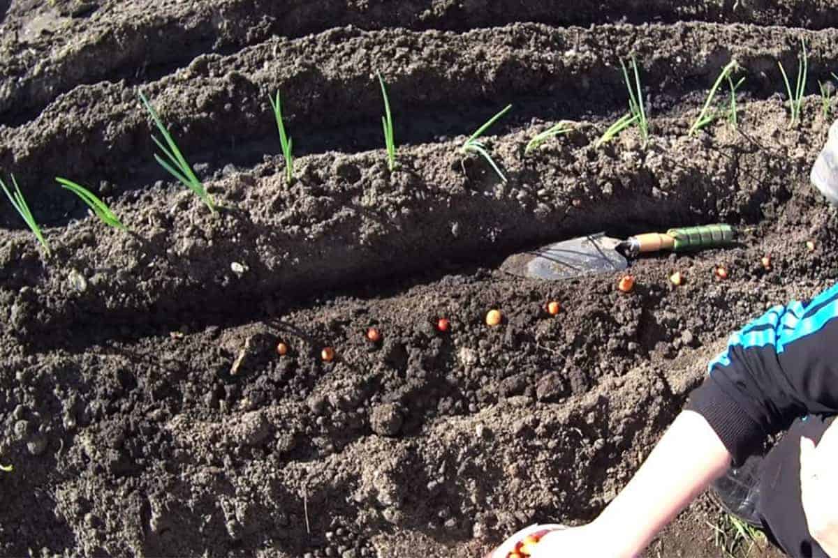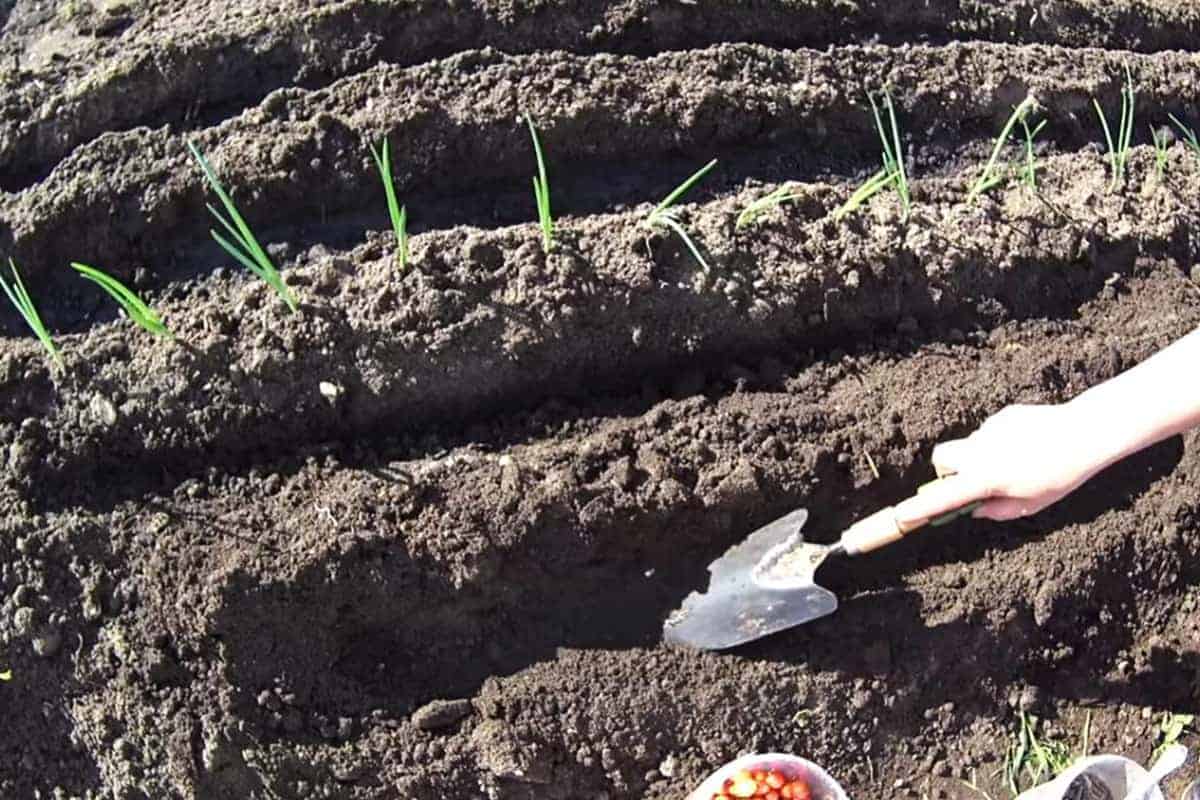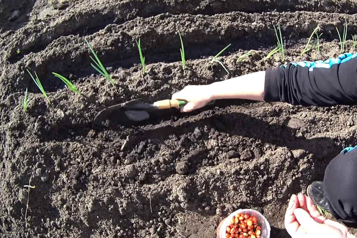 V zemine vytvorte hrebene a v nich urobte malé otvory pre cibuľky s hĺbkou 3 cm.