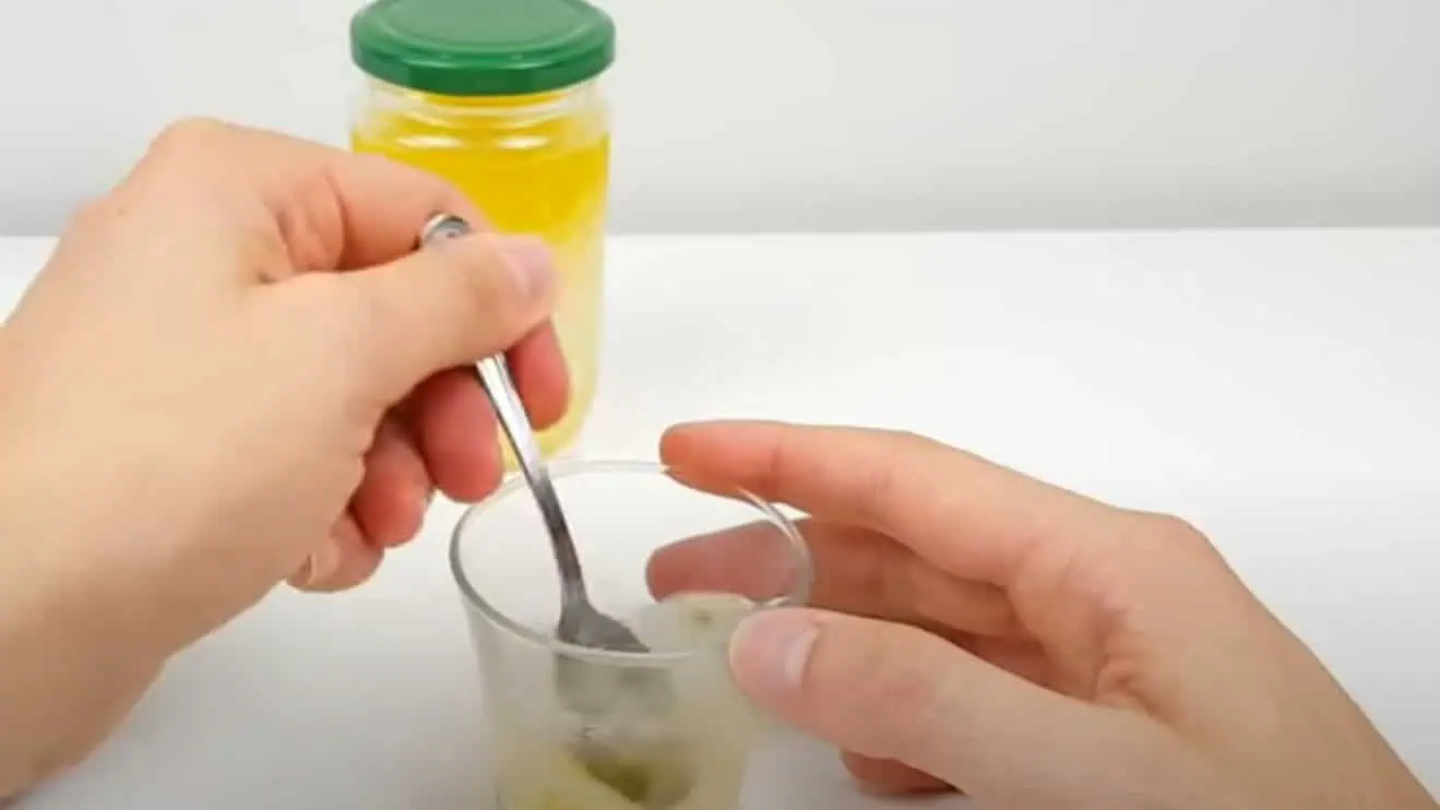 Potom nalejeme vodu do skleneného pohára s cesnakom a olejom, a pretrepeme.