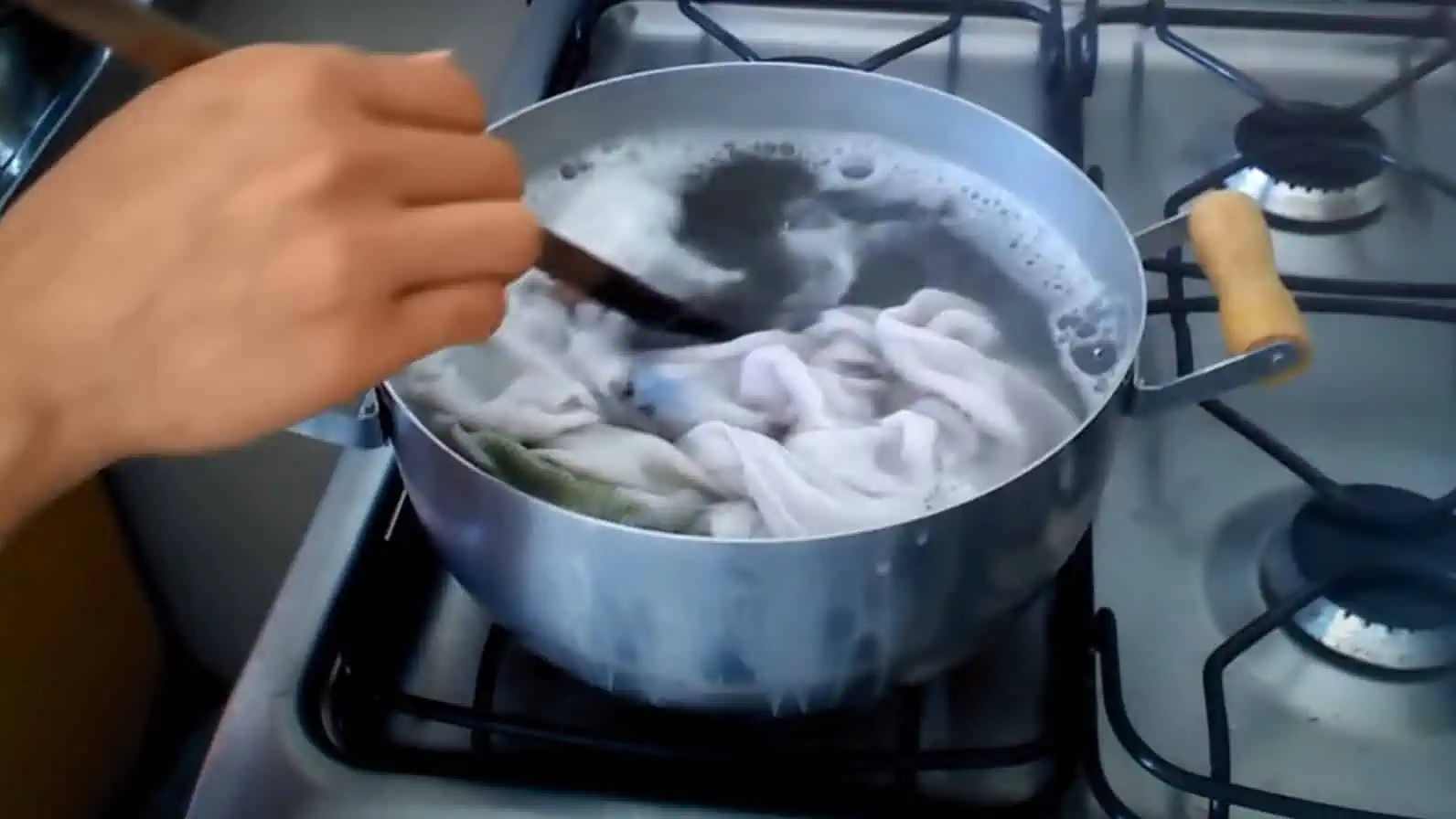 Do hrnca si nalejeme vodu a dáme ju zovrieť na sporák. Potom pridáme lyžicu pracieho prášku, lyžicu sódy bikarbóny a dobre premiešame.