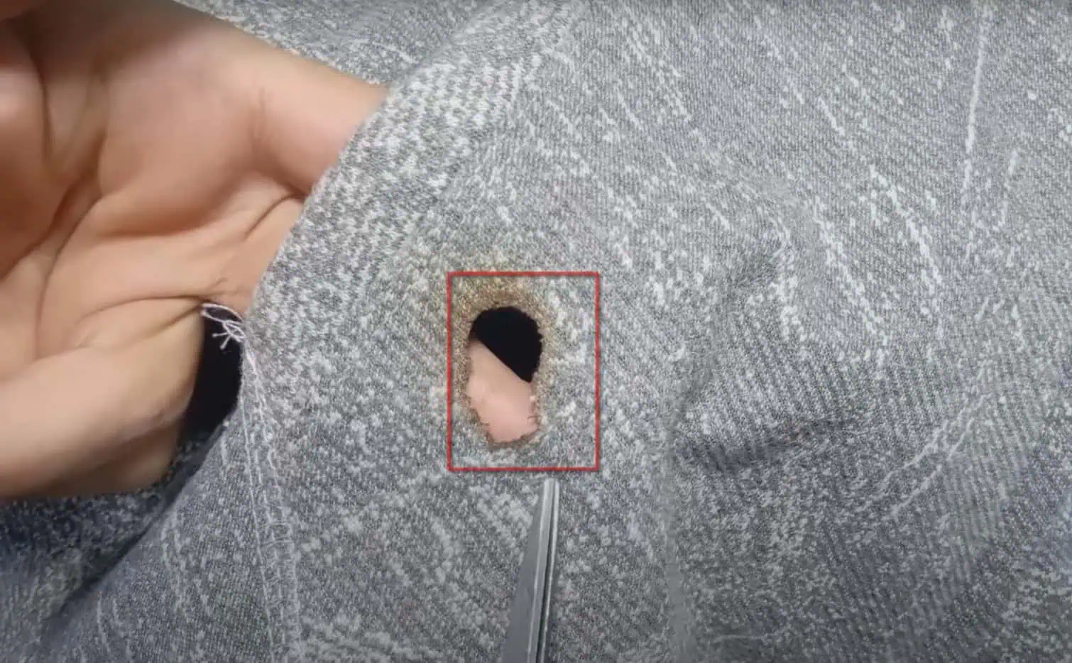 Ako prvé si vzniknutú dierku trochu upravte do pravidelného tvaru, ktorý sa bude lepšie zašívať a opatrne ju obstrihajte.
