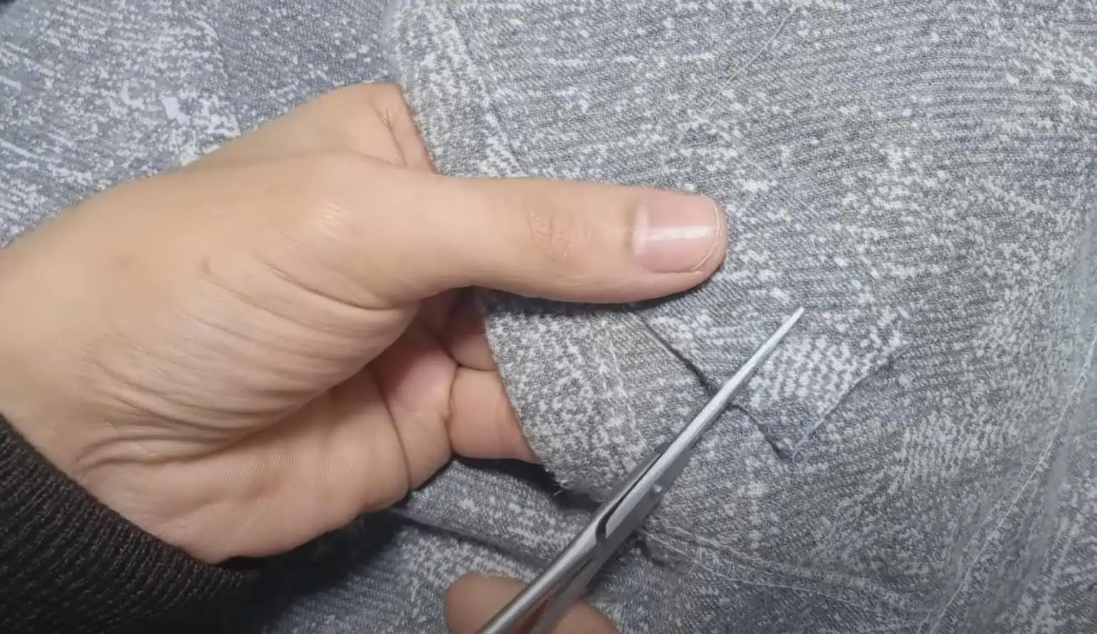 Keď máme záplatu z hornej strany našitú, zastrihneme si ju na presnú veľkosť diery, aby nám látka zbytočne nepresahovala.