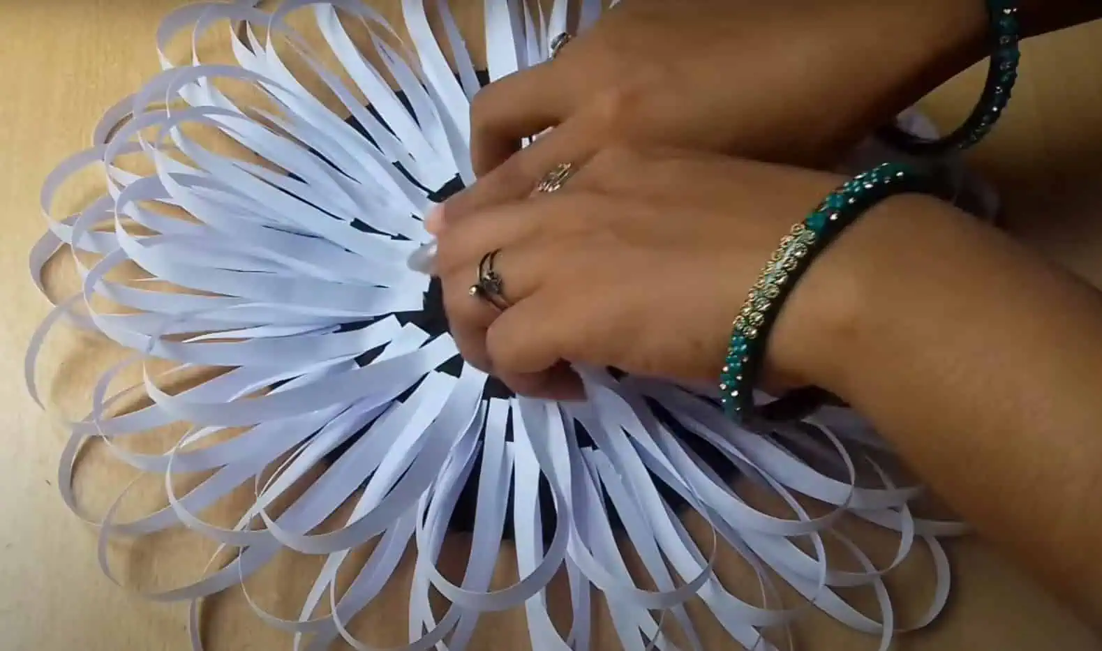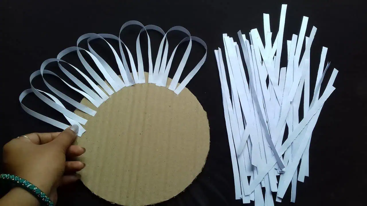 Teraz si oba konce papierových prúžkov postupne natrite lepidlom a nalepujte na kartónový kruh ako lupene asi v šiestich radoch.