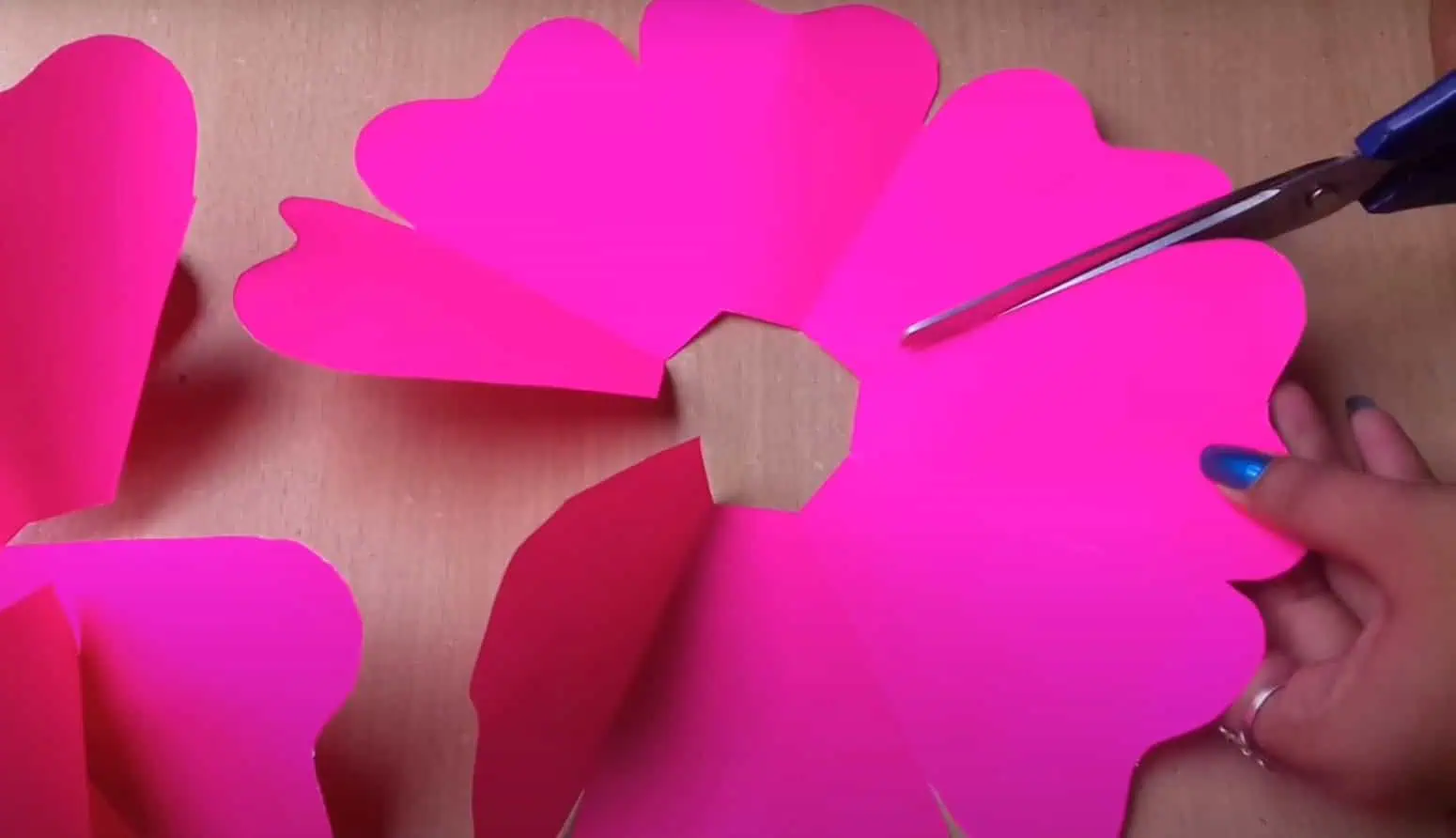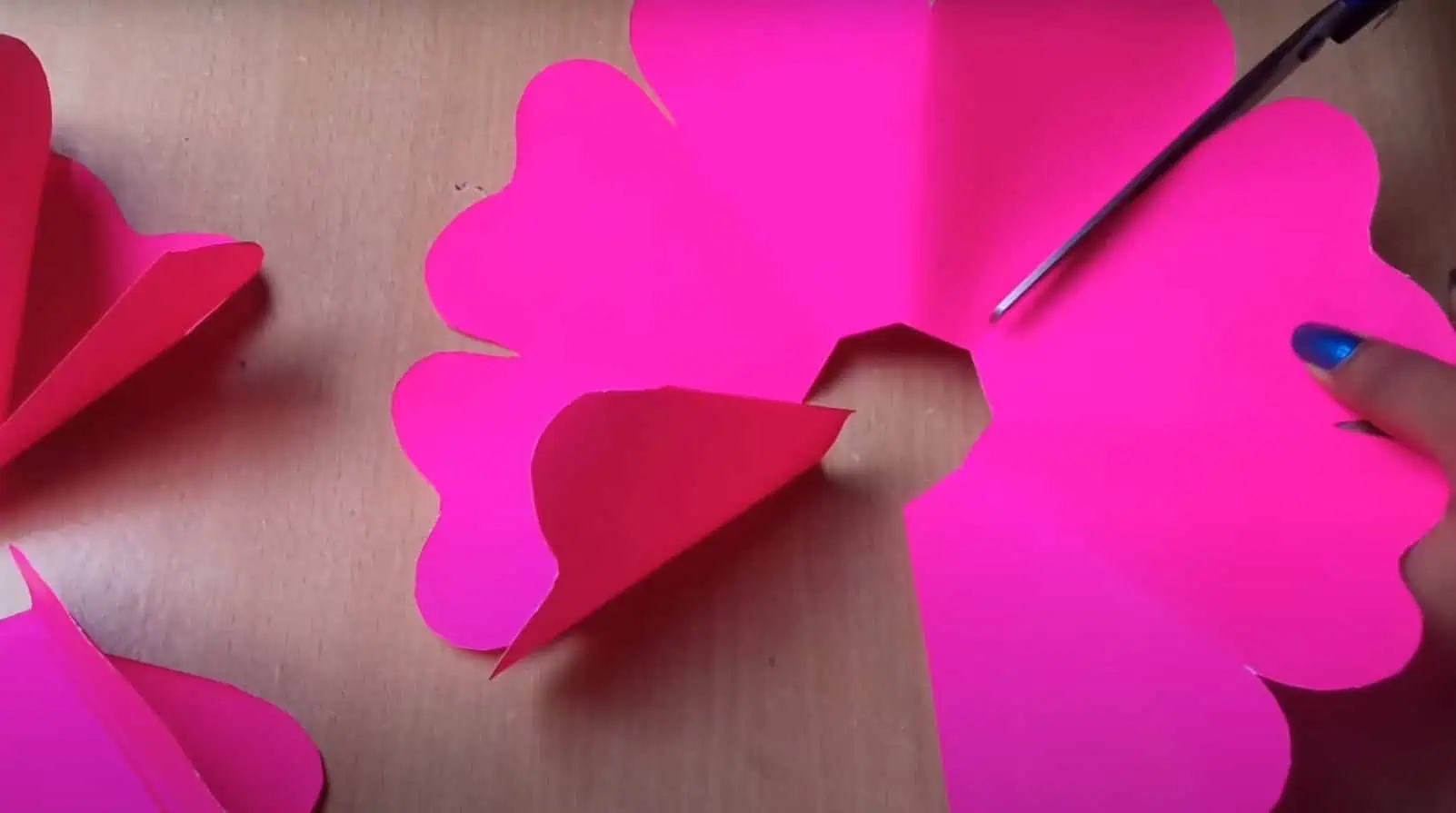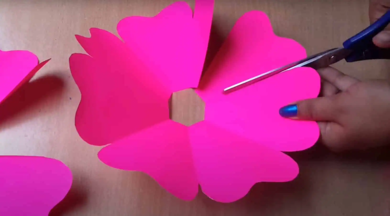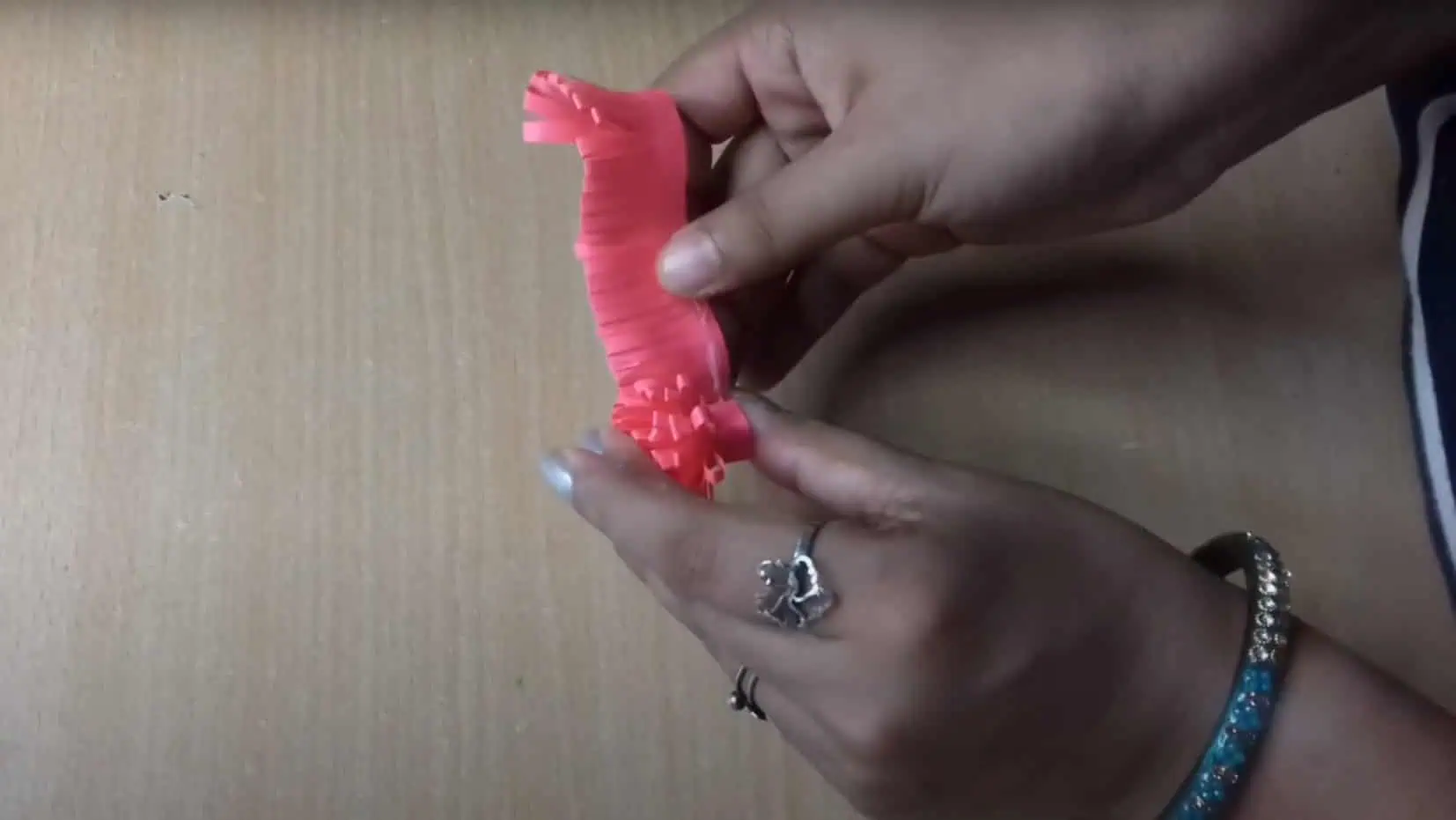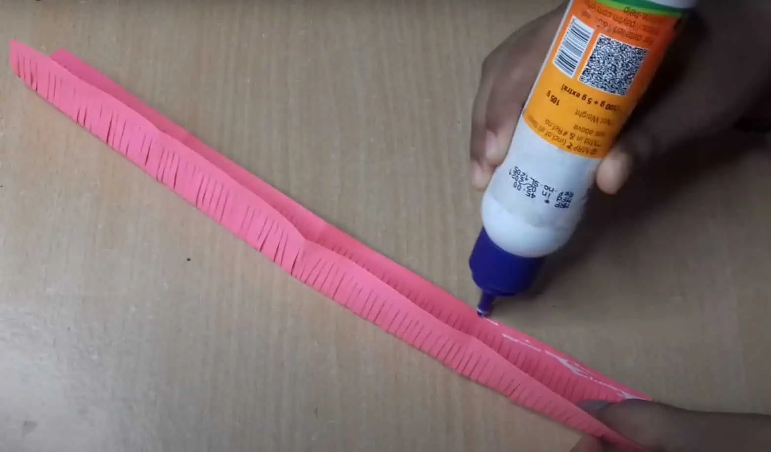 Teraz si prúžky ružového papiera prehnite na polovicu, nastrihajte z jednej strany vedľa seba tak, aby pôsobili rozstrapkane, potom prehnite do opačnej strany a zalepte.