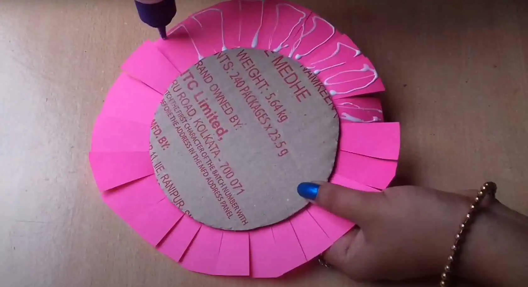 Okraje zahneme a prilepíme na druhú stranu, aby sme kartónový kruh začistili a na spodok nalepíme ešte jeden začisťovací ružový kruh papiera.