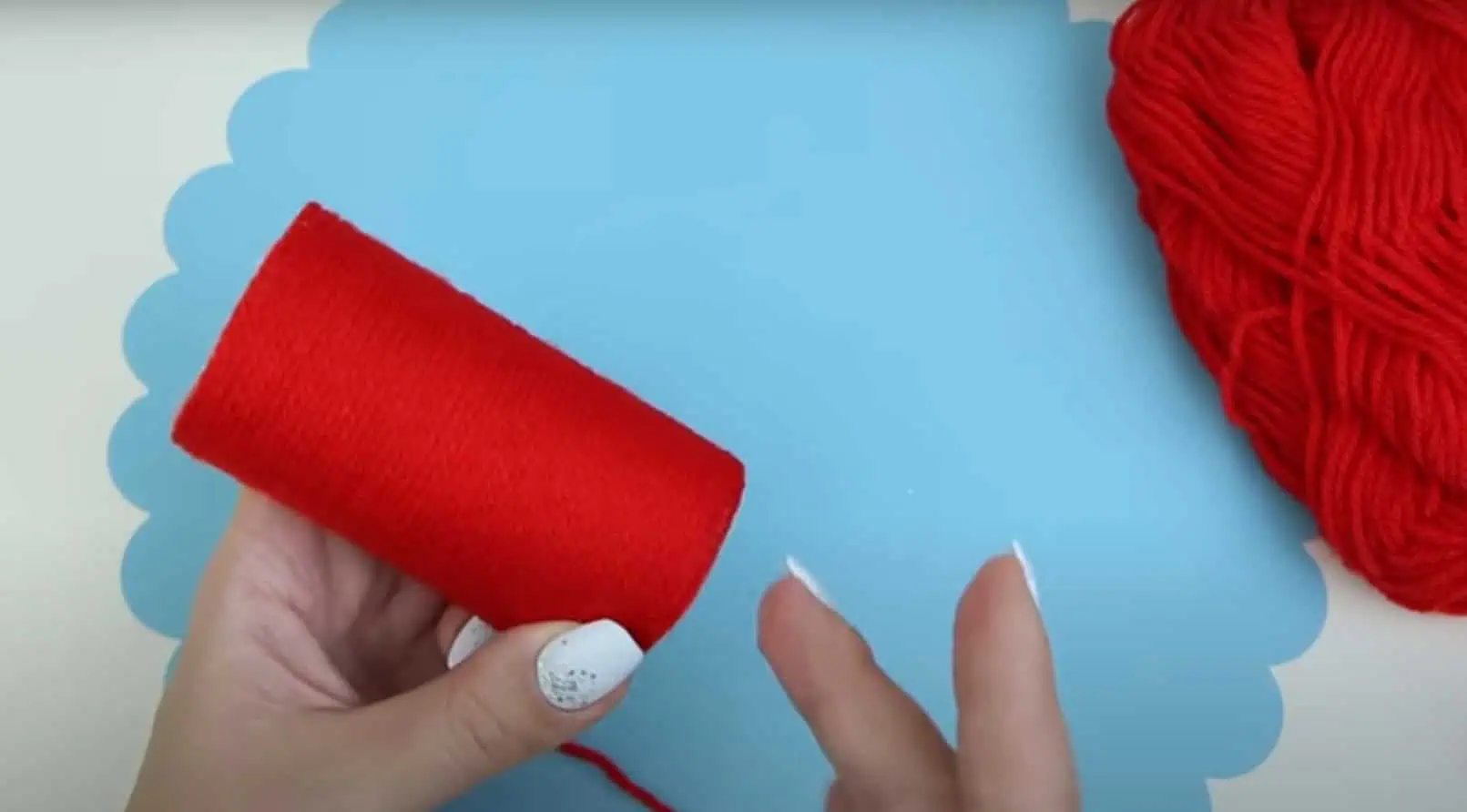 Ruky si vyrobíme tak, že červenú priadzu omotáme 15-krát okolo 3 prstov a potom previažeme bielou priadzou.