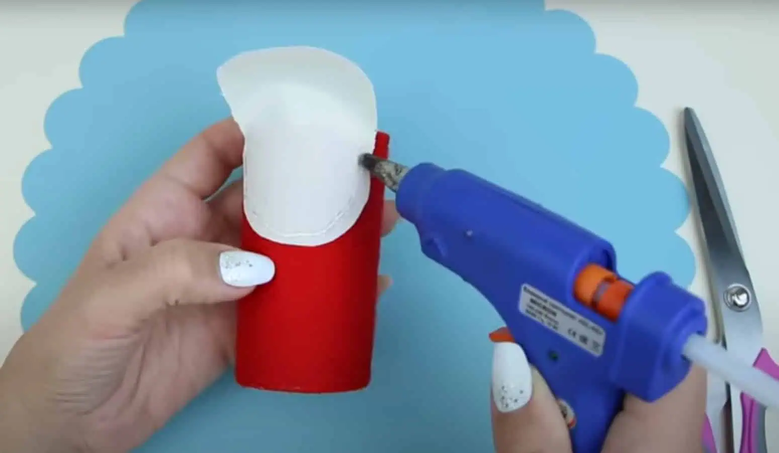 Ako prvé si zoberieme papierovú rolku a oblepíme ju červenou priadzou pomocou taviacej pištole.