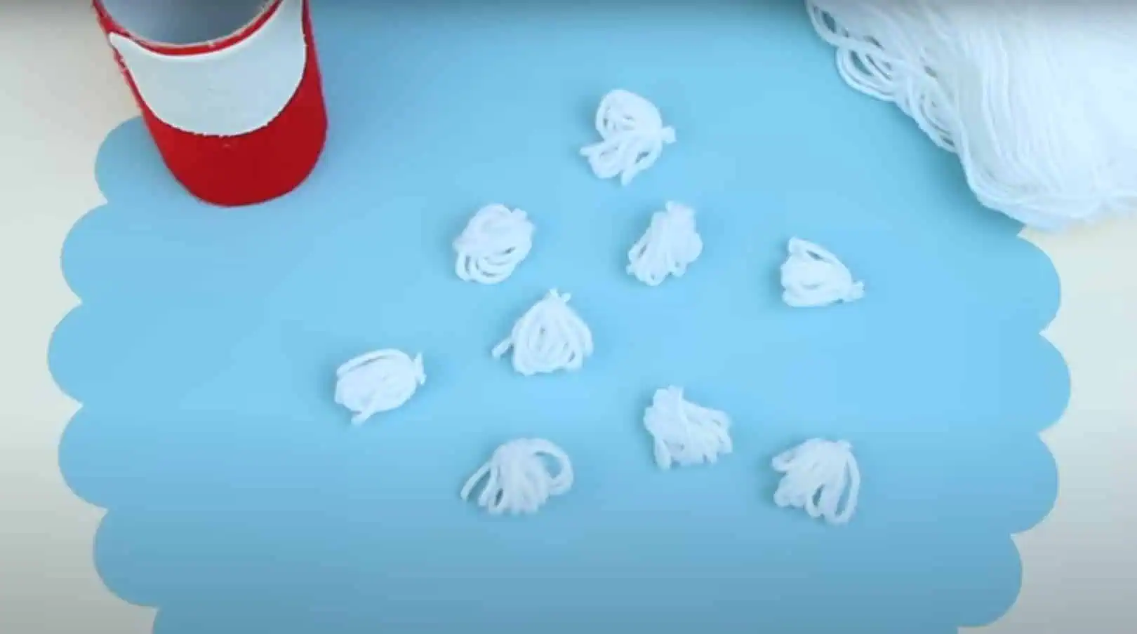 Teraz si vytvoríme čiapku tak, že na biely pás nalepujeme priadzu, ktorú sme si 5-krát omotali okolo 4 prstov.