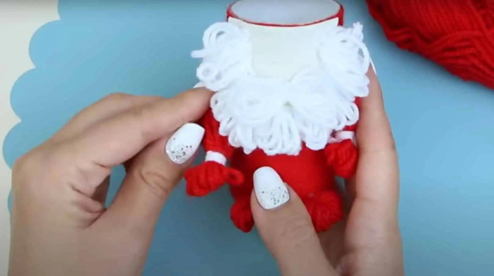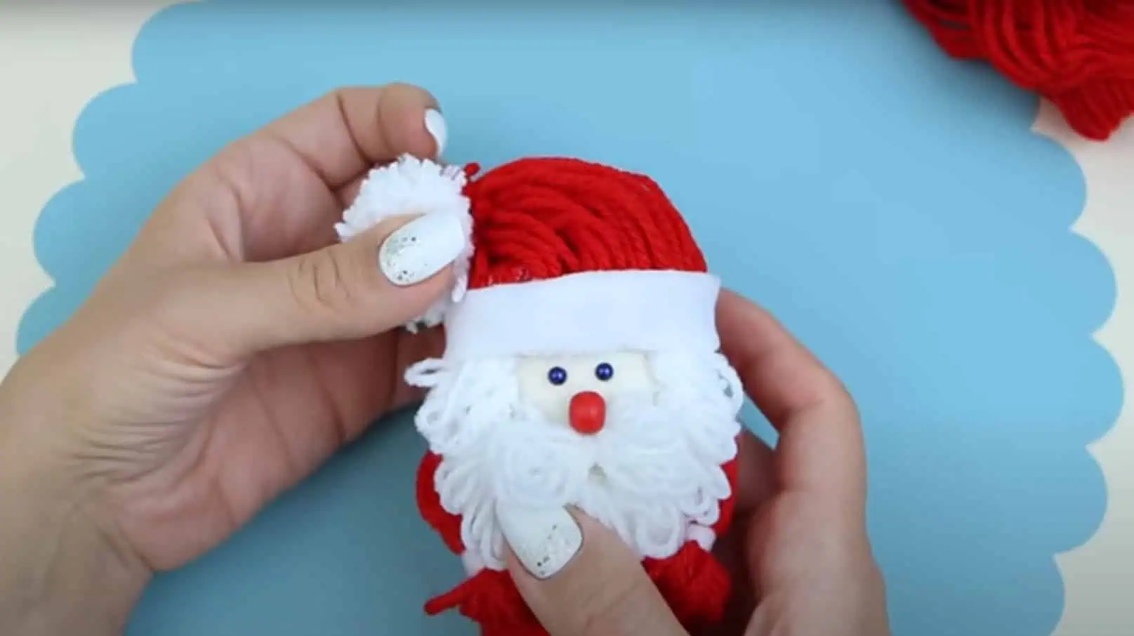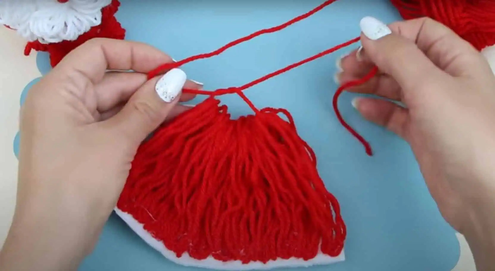 Takto pripravenú čiapku nalepíme na hlavu Santa Clausa a na jednom boku zafixujeme kúskom priadze, pričom koniec odstrihneme.