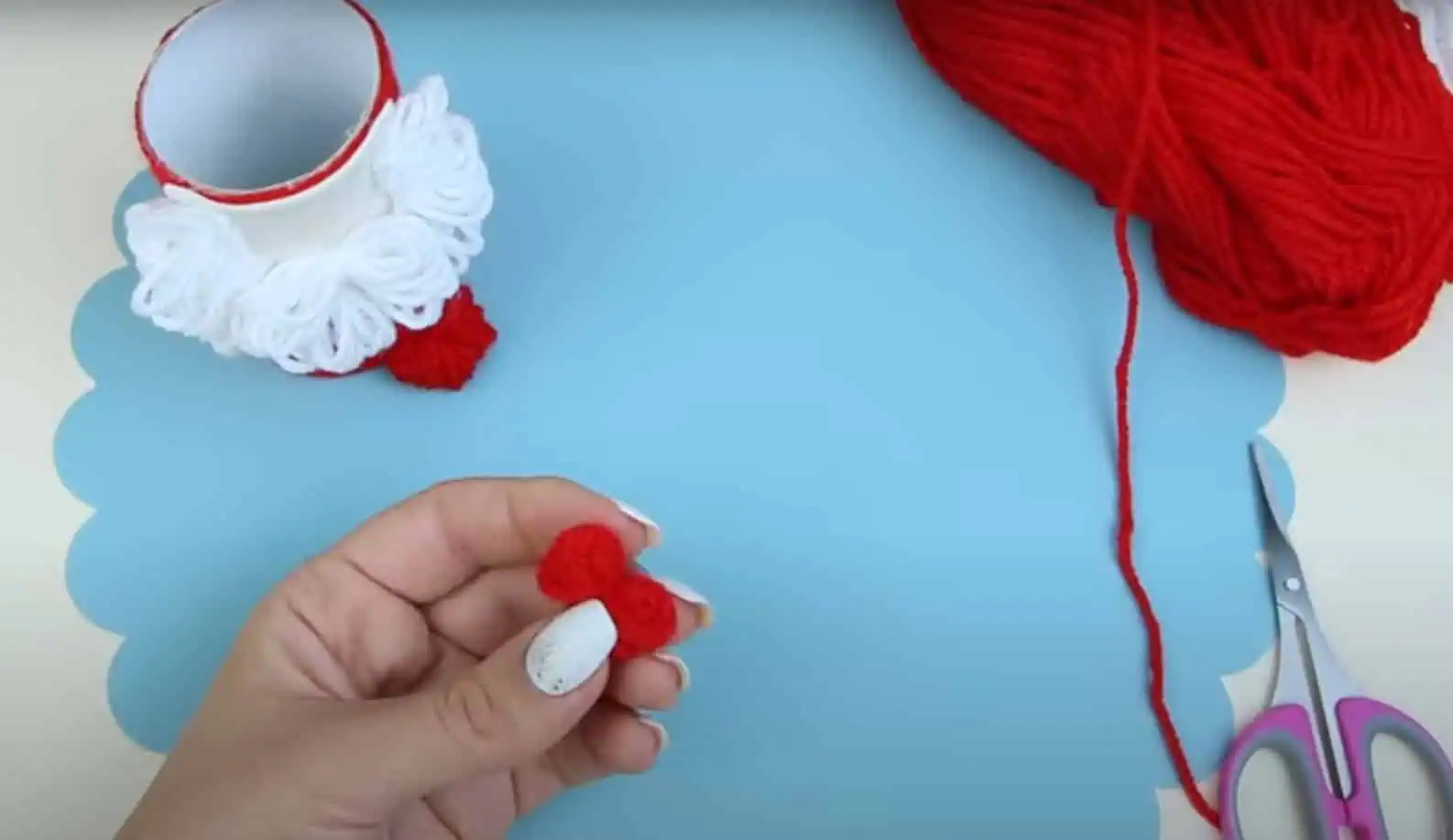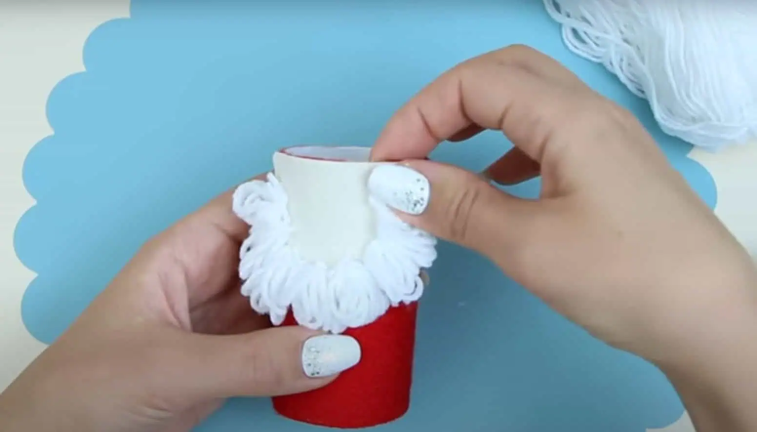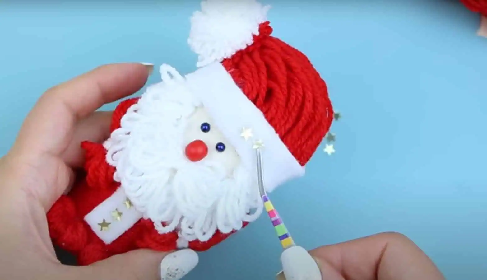 Takto pripravenú čiapku nalepíme na hlavu Santa Clausa a na jednom boku zafixujeme kúskom priadze, pričom koniec odstrihneme.