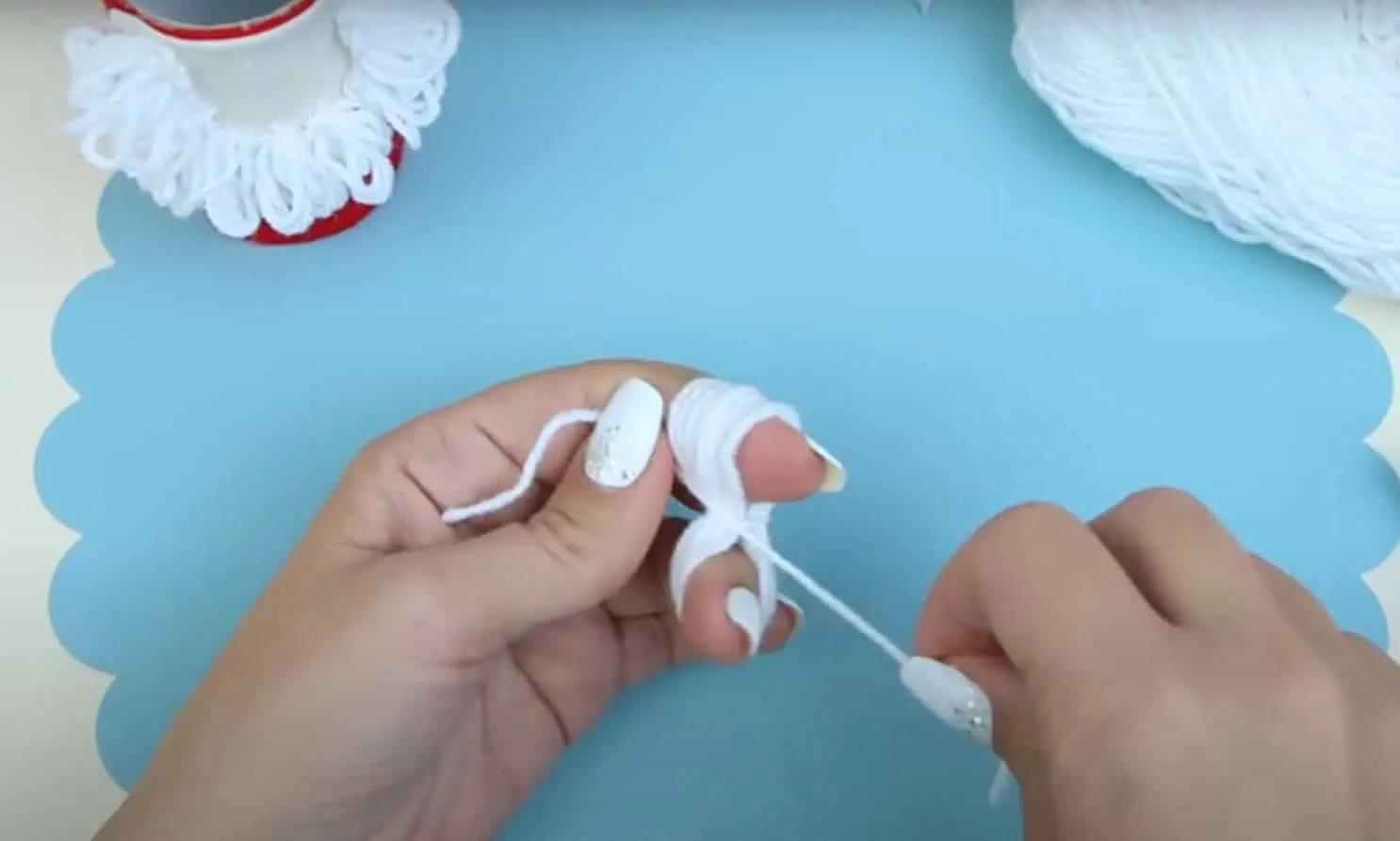 Z bielej priadze si vytvoríme časti brady tak, že si 10-krát omotáme priadzu okolo prsta a potom ju kúskom priadze zafixujeme.