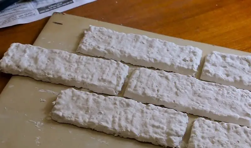 Nechajte tehličky vysušiť po dobu 3-4 hodín. Potom naneste na každý kúsok vrstvu obyčajného tmelu, zriedeného s vodou.