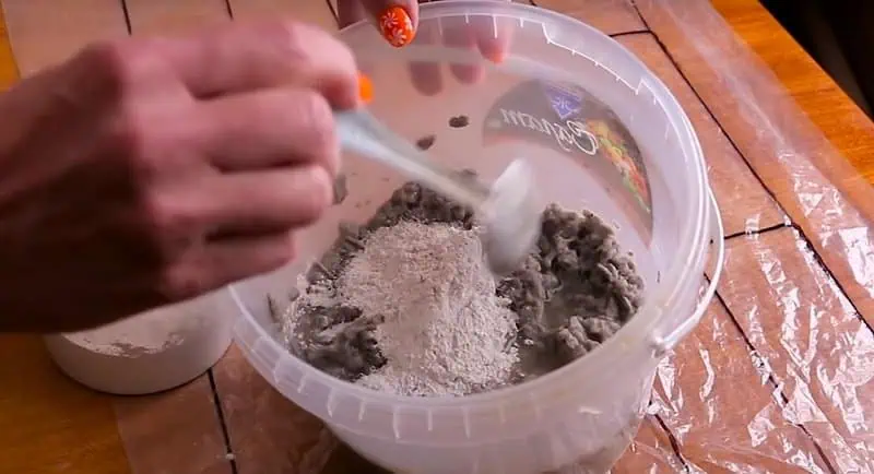Keď je kartónová hmota takmer úplne rozpustená, pridajte k nej 2 polievkové lyžice sadry a dôkladne premiešajte. Pre dostatočnú hustotu môžete podľa potreby pridať ešte viac sadry.