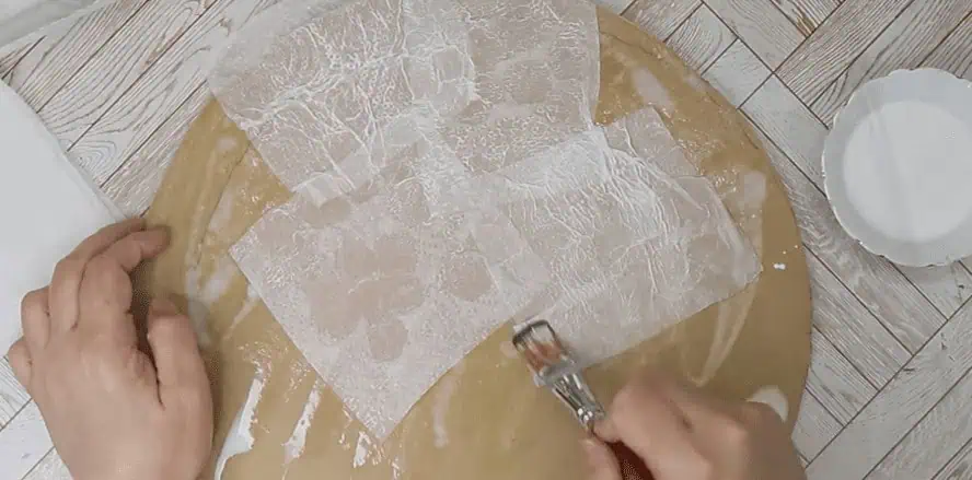 Potom ním natrieme kartónový kruh, ktorý oblepíme papierovými utierkami rozdelenými na jednotlivé tenké časti.