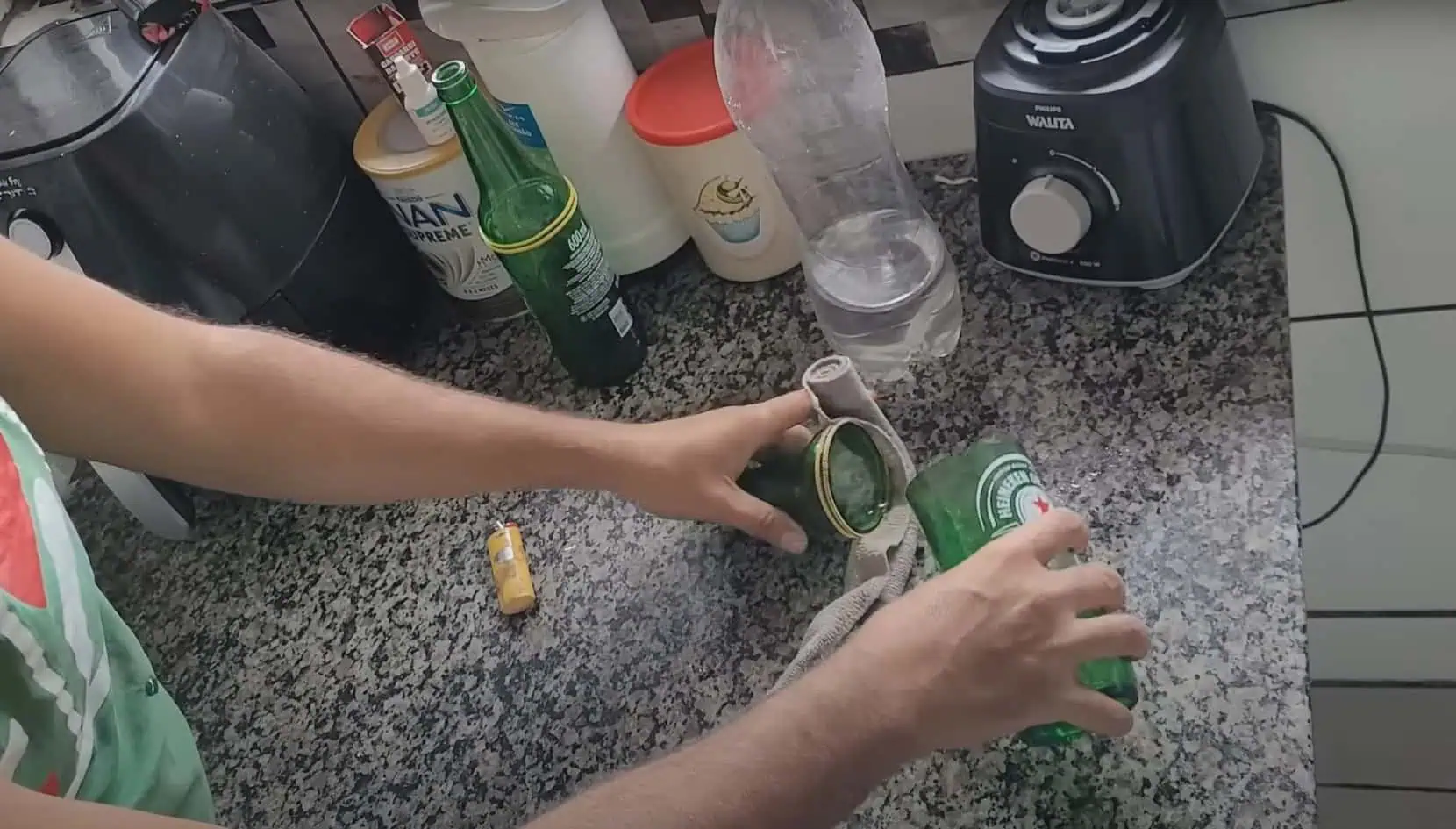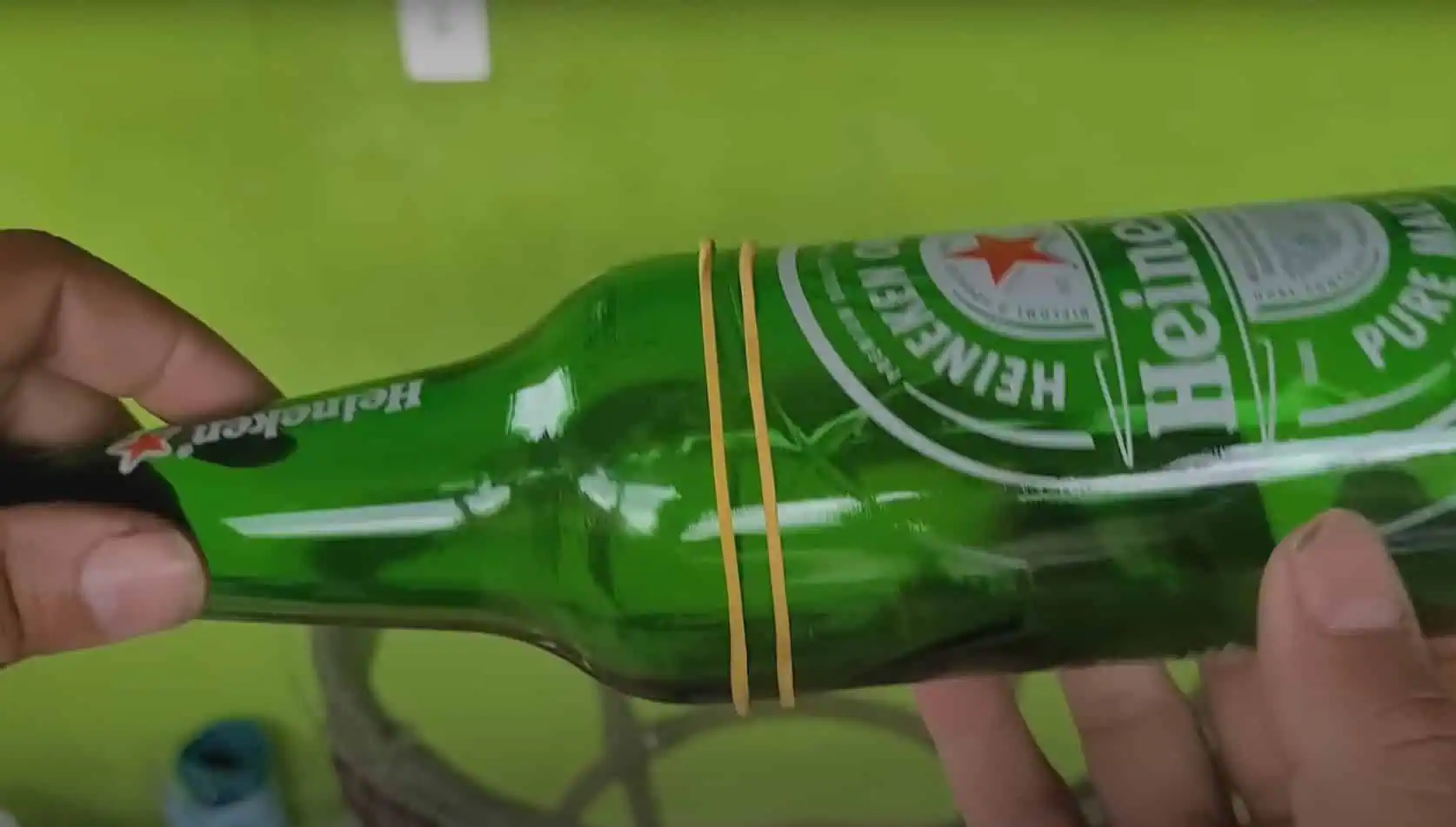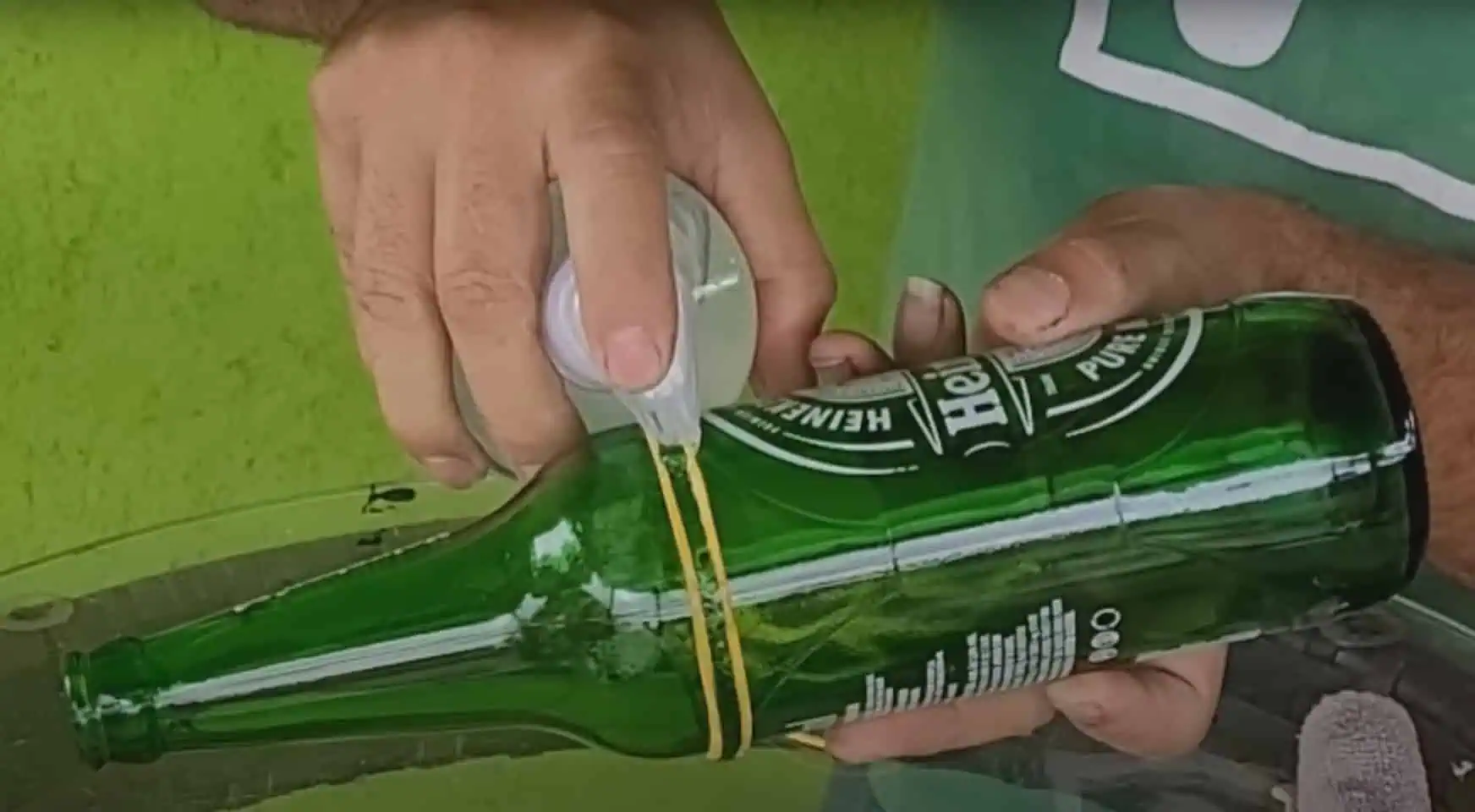 Zoberieme si sklenenú fľašu a pod hrdlo umiestnime prvú gumičku.