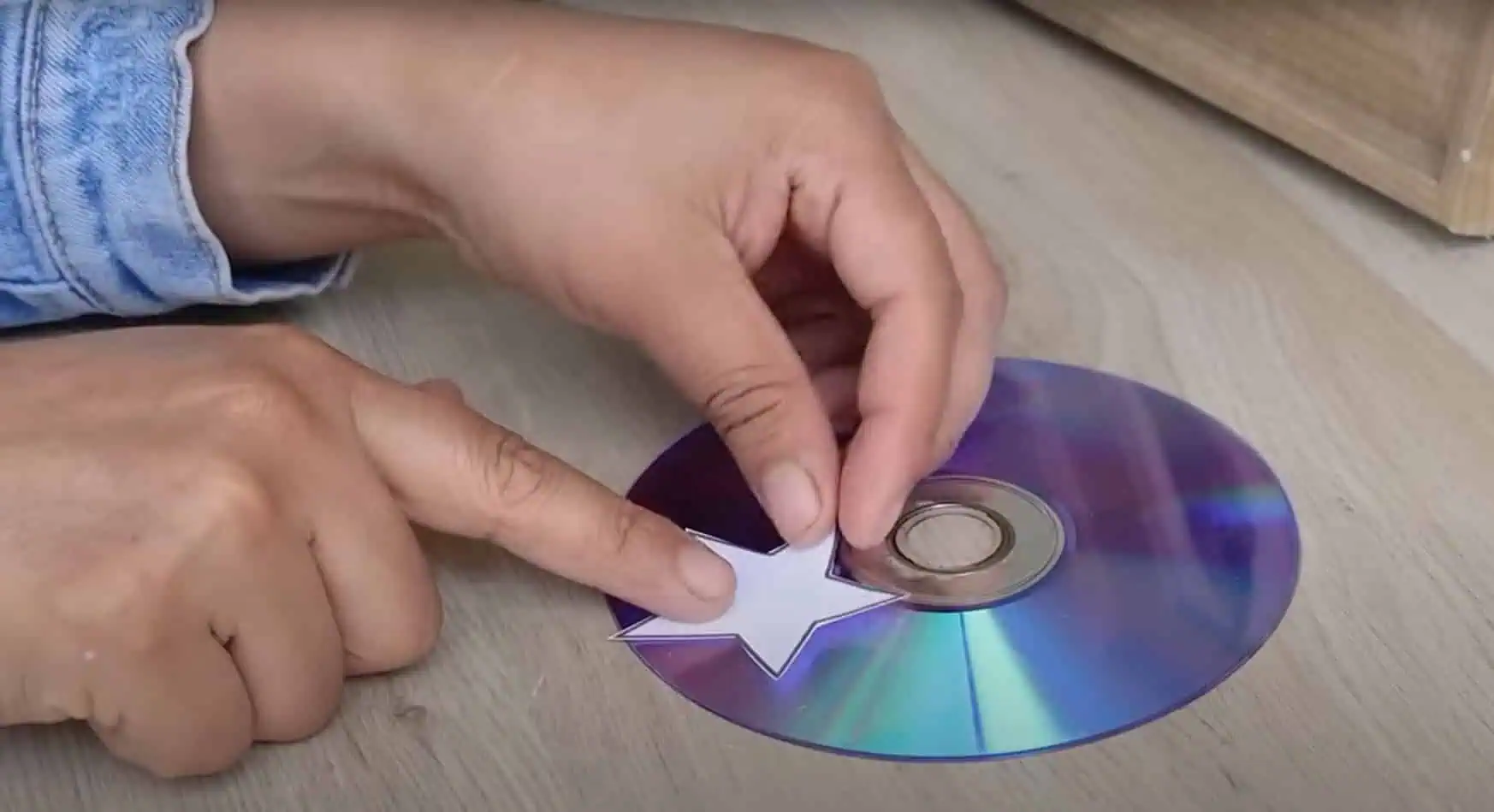 Oddelíme spodná časť CD, podľa šablóny obkreslíme hviezdu a vystrihneme.