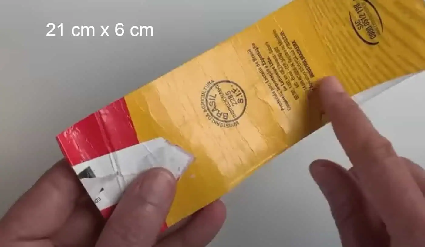Krabicu od mlieka si dobre umyjeme a vystrihneme si obdĺžnik s rozmerom 21 x 6 cm.