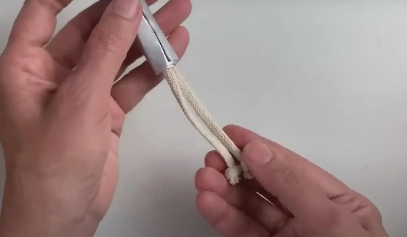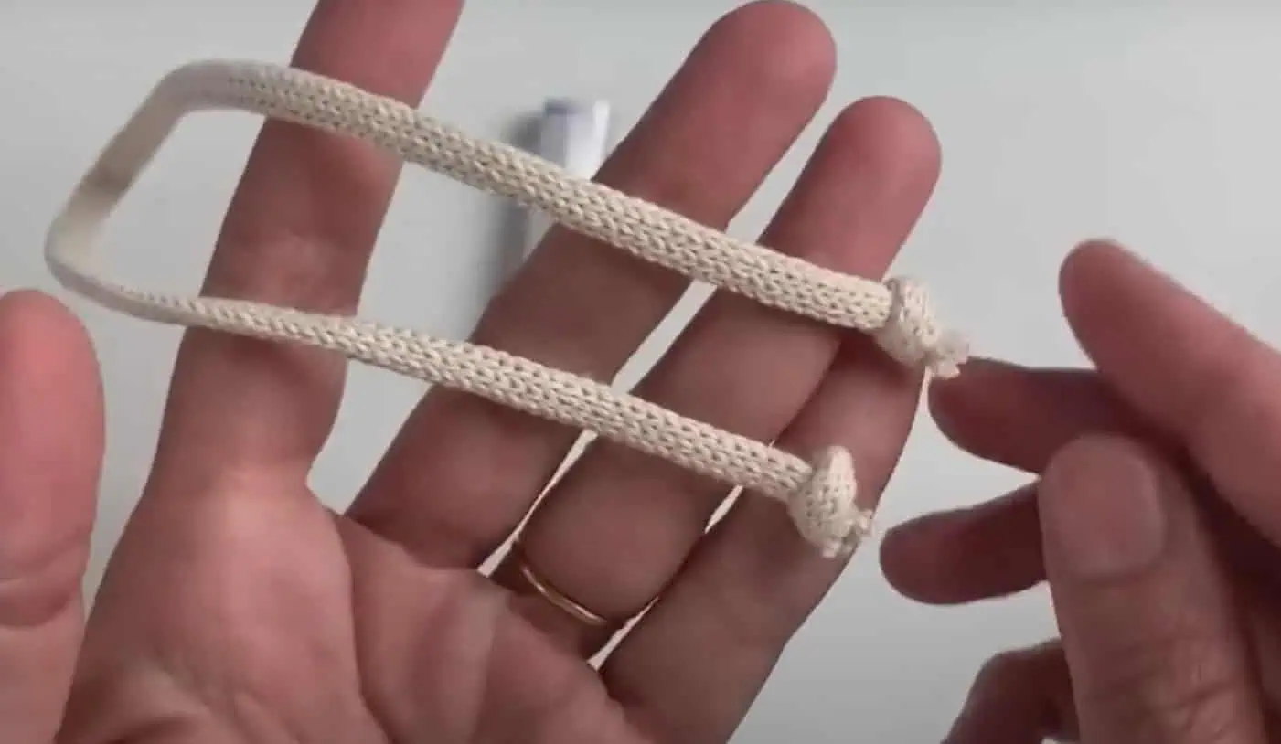 Zoberieme si šnúrku od topánok, prestrihneme ju na polovicu a na koncoch urobíme dva uzlíky.