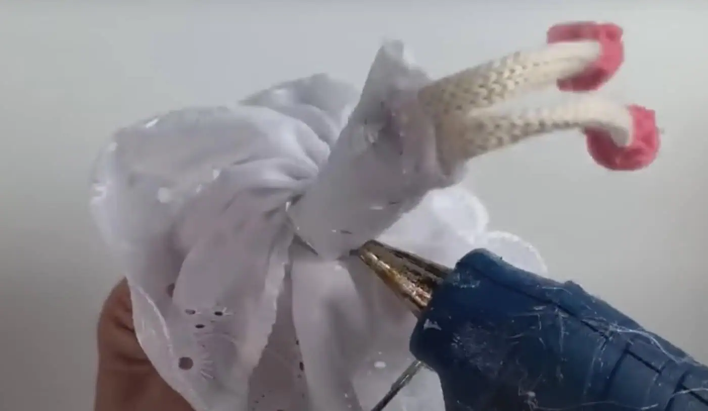 Druhú časť šnúrky si v strede zauzlíme a oba konce prilepíme k sebe pomocou lepiacej pištole.
