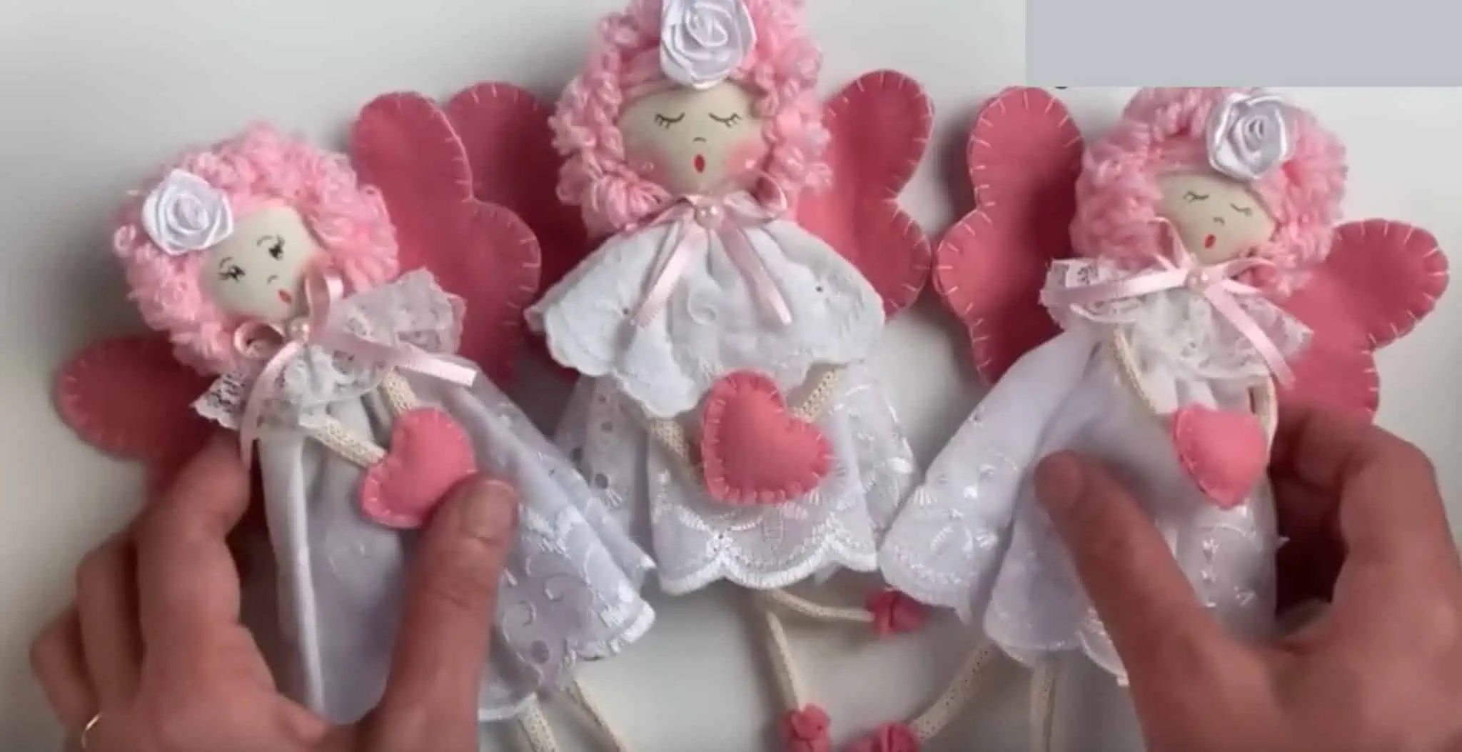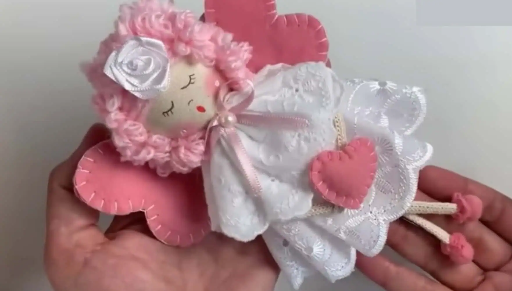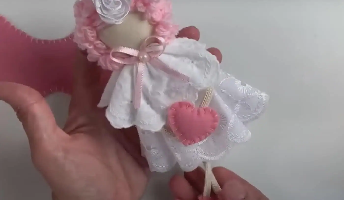 Nakoniec ešte do rúk vložíme (nalepíme) srdiečko, ktoré sme si ušili a vyplnili vatou. Hotovo.
