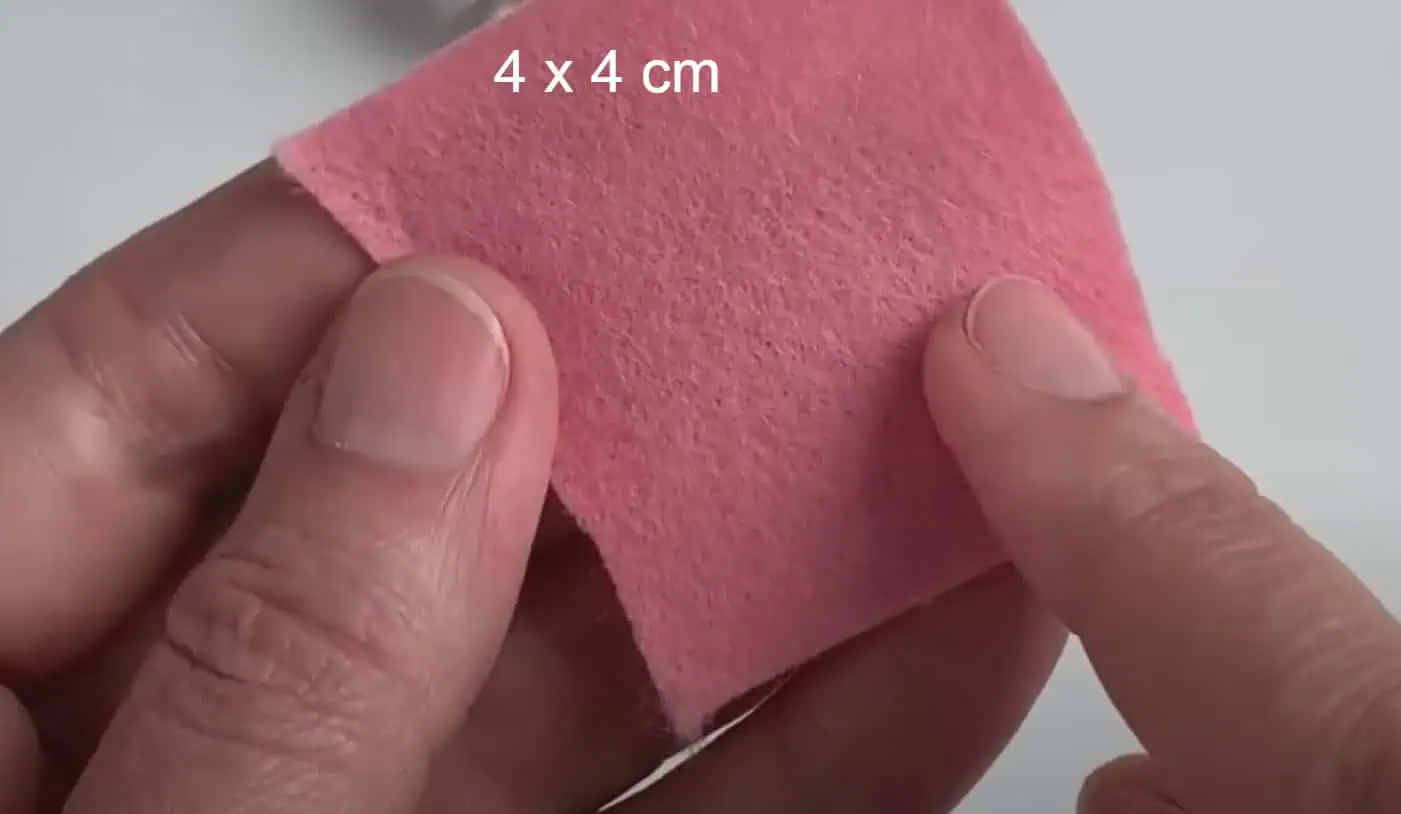Z ružovej látky si vystrihneme dva štvorce s rozmerom 4 x 4 cm.