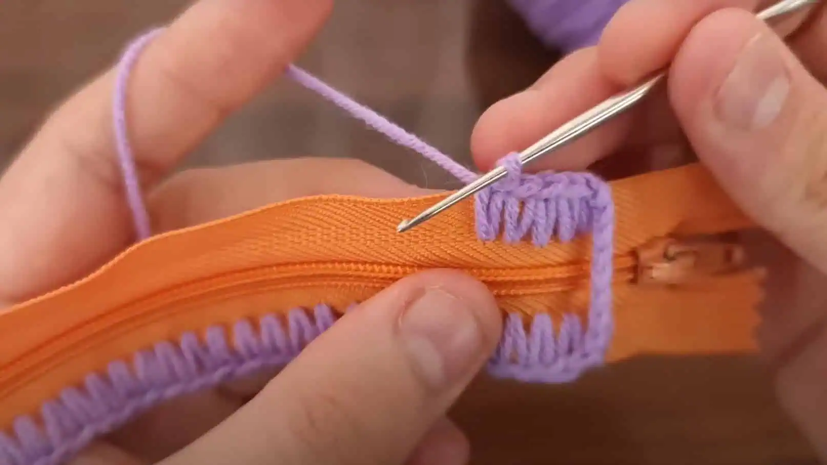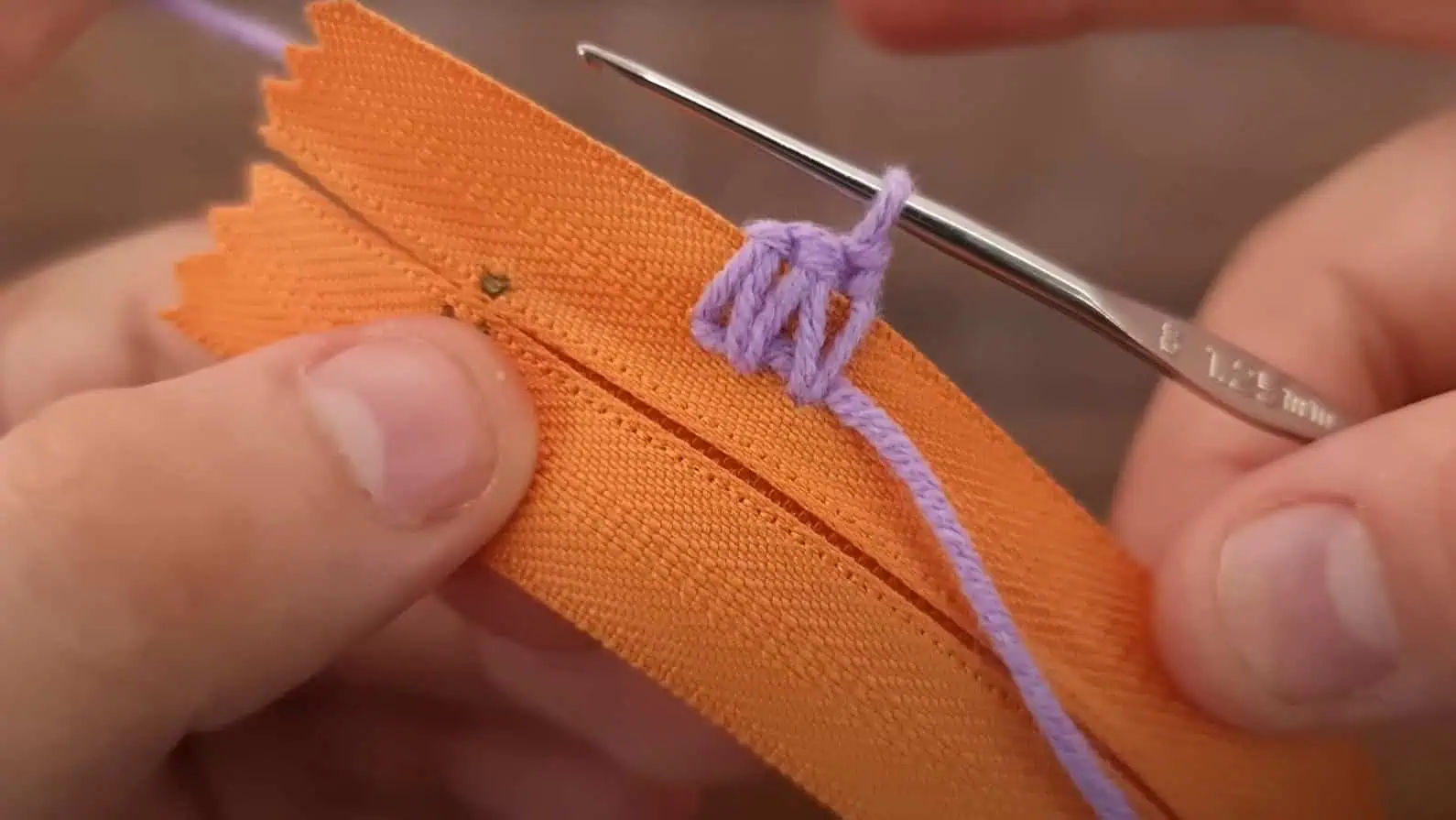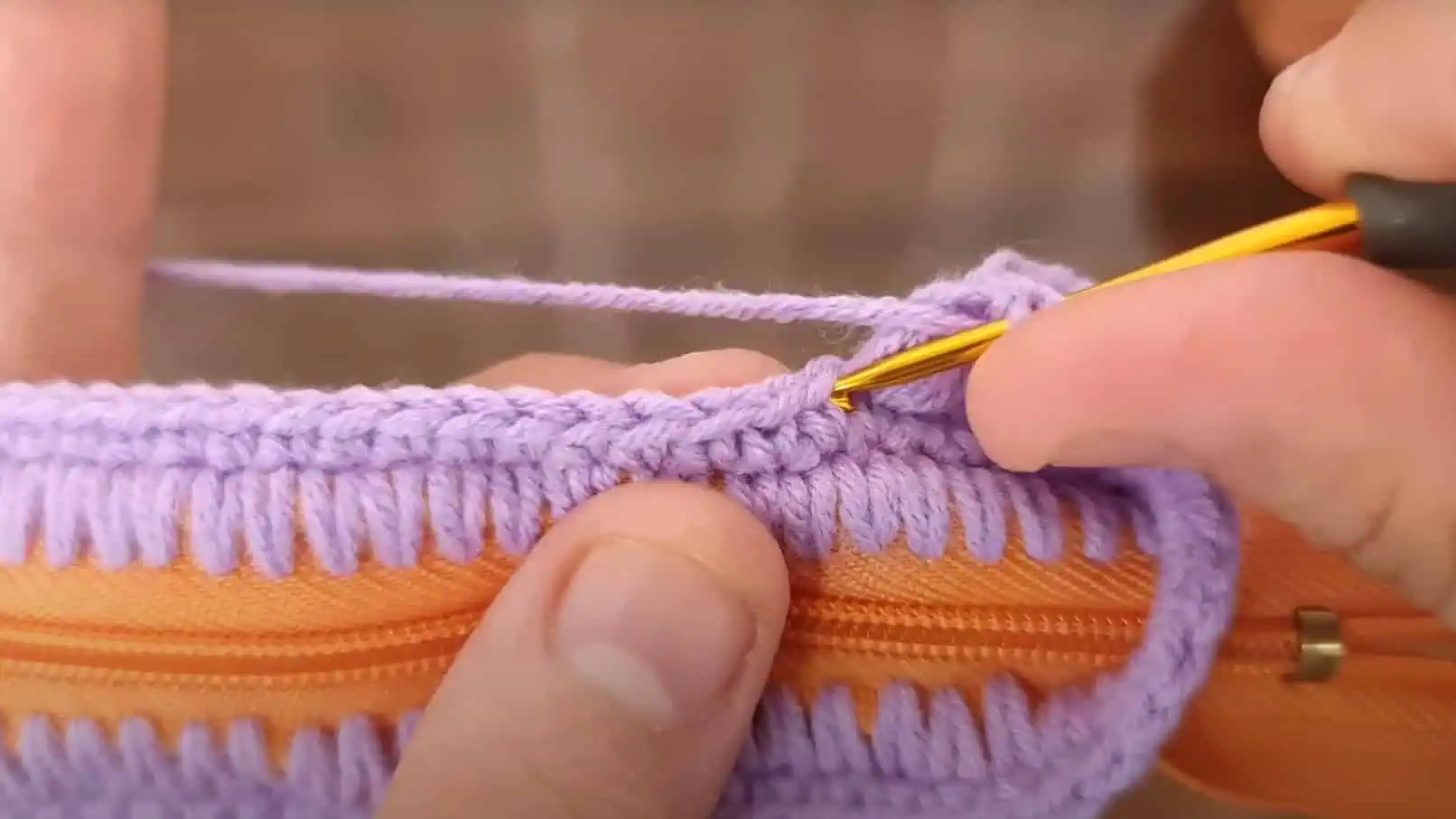 Ako prvé začnite háčkovať po obvode zipsu.