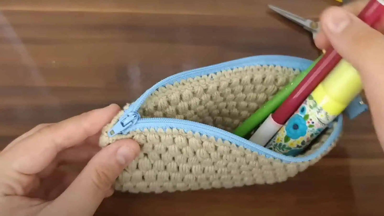 Otočte si taštičku zipsom dolu a na spodku spojte háčkovaním.