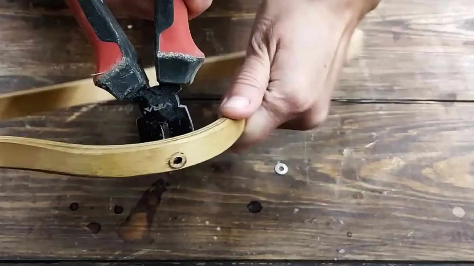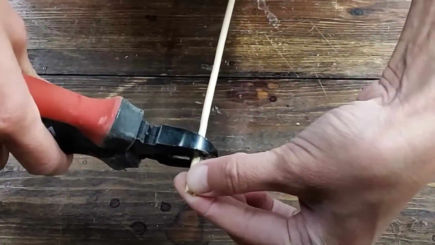 Do stredu cez dieru prevlečte hrubšiu drevenú tyčku, ktorý si skráťte pomocou klieští.