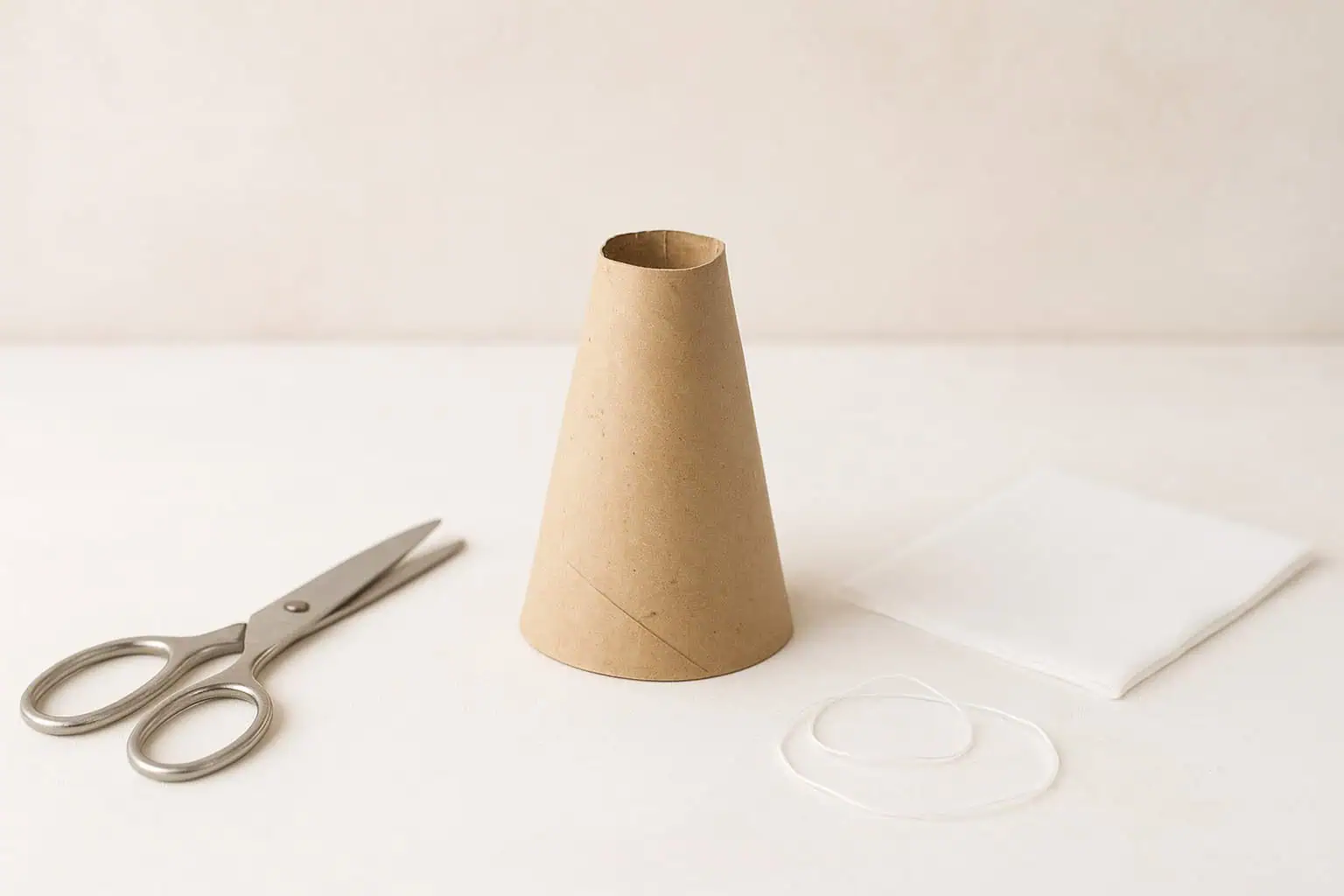 Rolku z toaletného papiera zrežte po dĺžke a stočte ju do tvaru kužeľa. Koniec prilepte alebo spojte lepiacou páskou – vznikne základ tela anjelika.