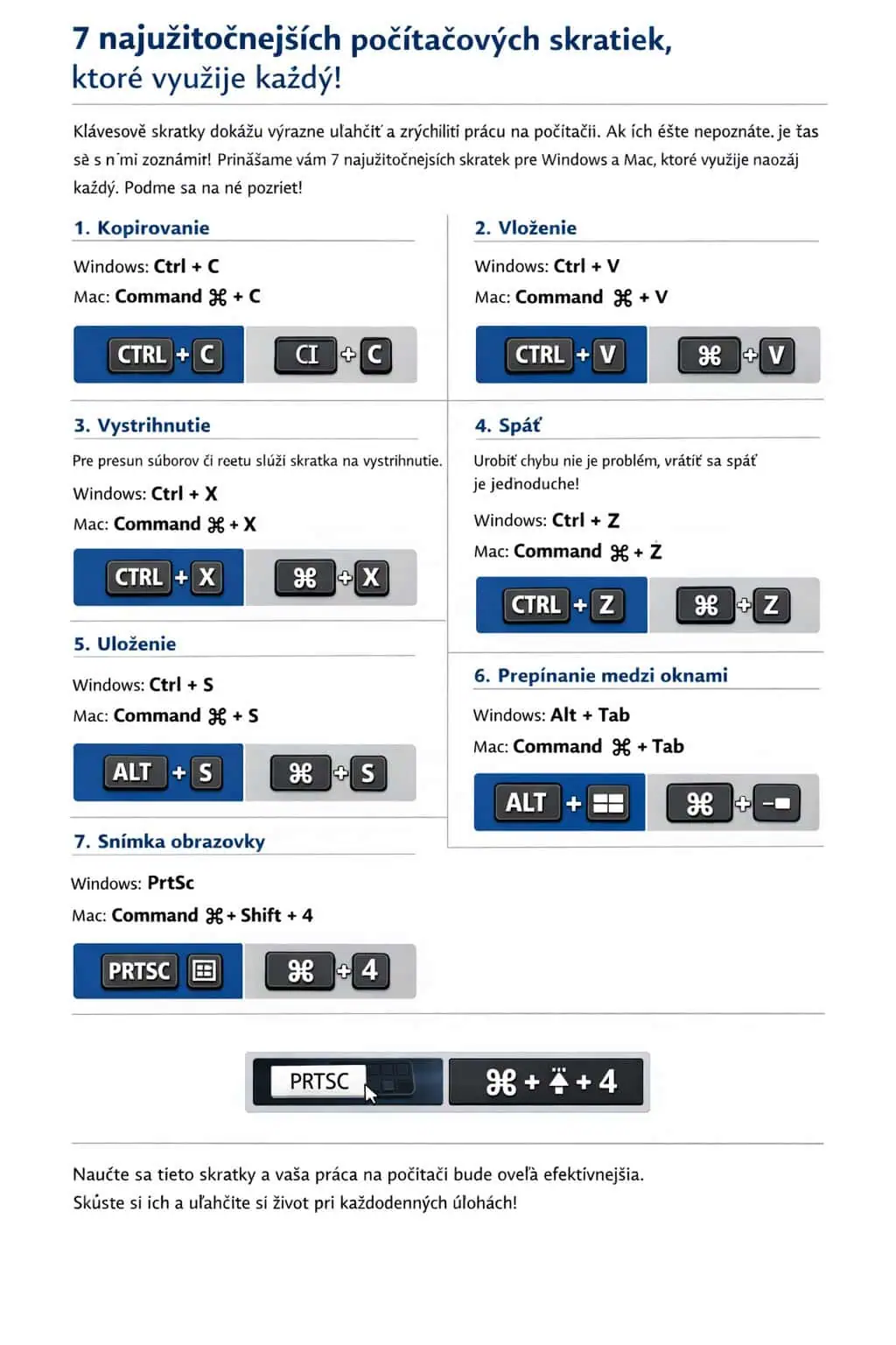 Ovládanie základných klávesových skratiek Vám výrazne uľahčí každodennú prácu na počítači. Vďaka nim budete pracovať rýchlejšie, efektívnejšie a pohodlnejšie.