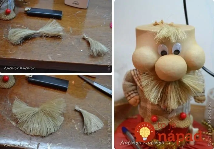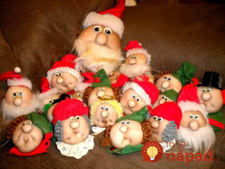 Na vrchnú časť – hlavu pripevníme nos a oči, ktoré vytvoríme pomocou korálikov. Farbu na líčkach vytvoríme pomocou farby. Potom prišijeme ruky bábky a z obyčajných ponožiek vytvoríme bábike jednoduchí oblečenie a čiapku.