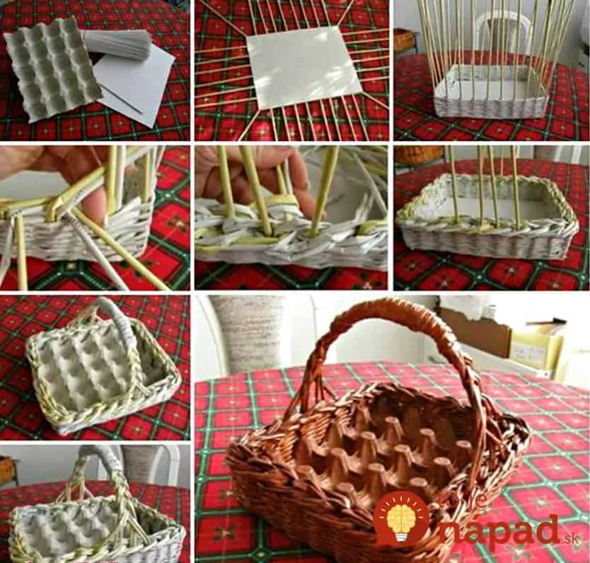 - Tkaný košík z novín a kartónu od vajec. Úžasný nápad pre šikovné ruky a trpezlivú myseľ.