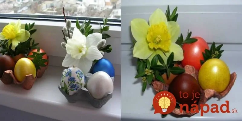 - Vezmite pár umelých, alebo živých kvetov, kraslice a vystrihnite časť z kartónu. Krásna ozdoba na parapetu.