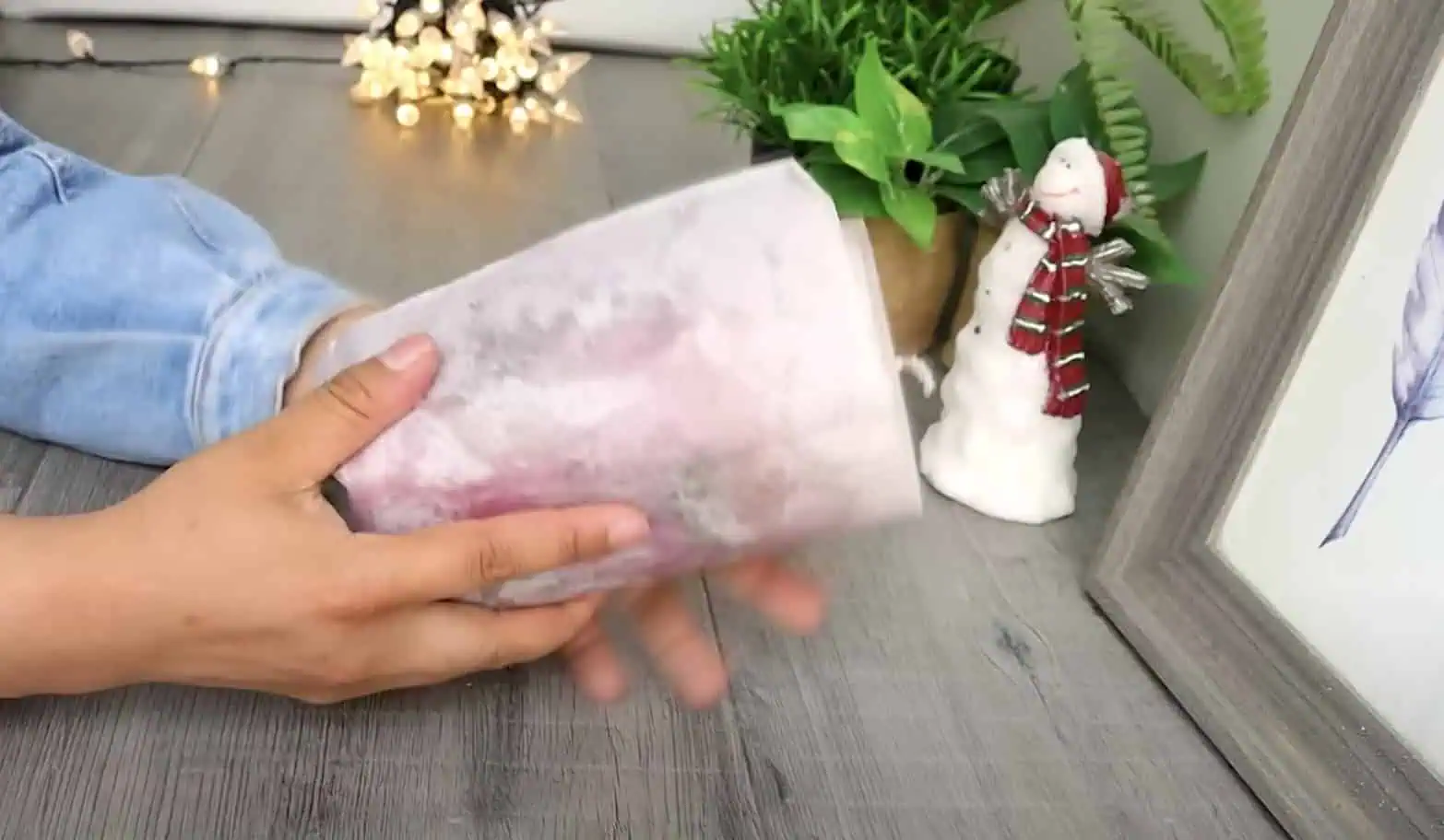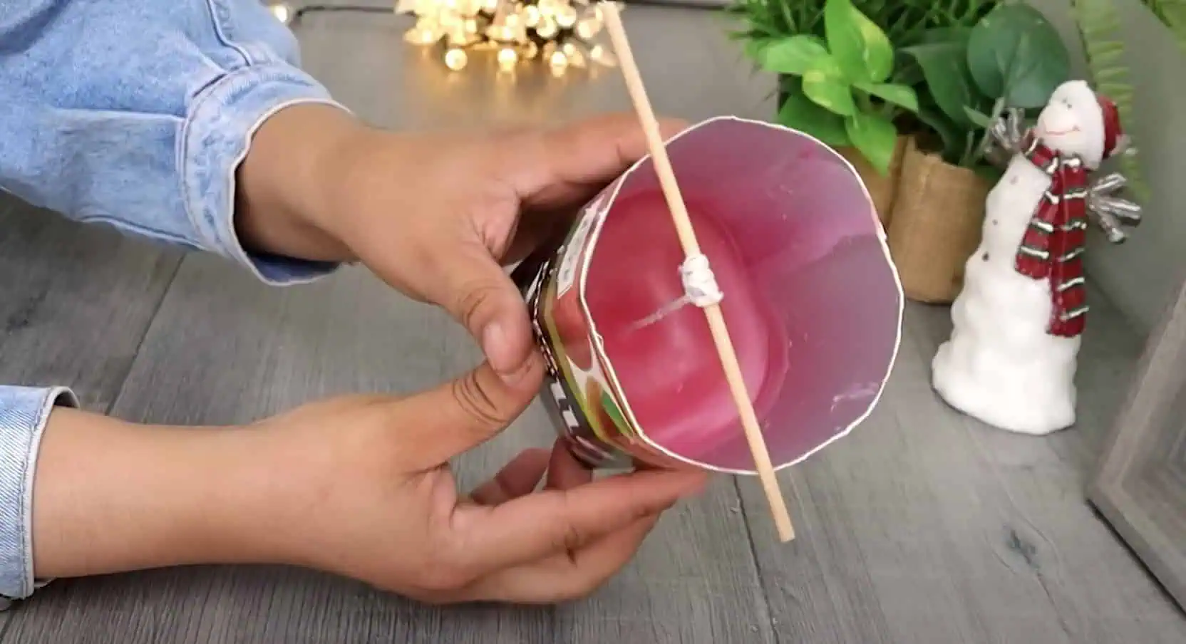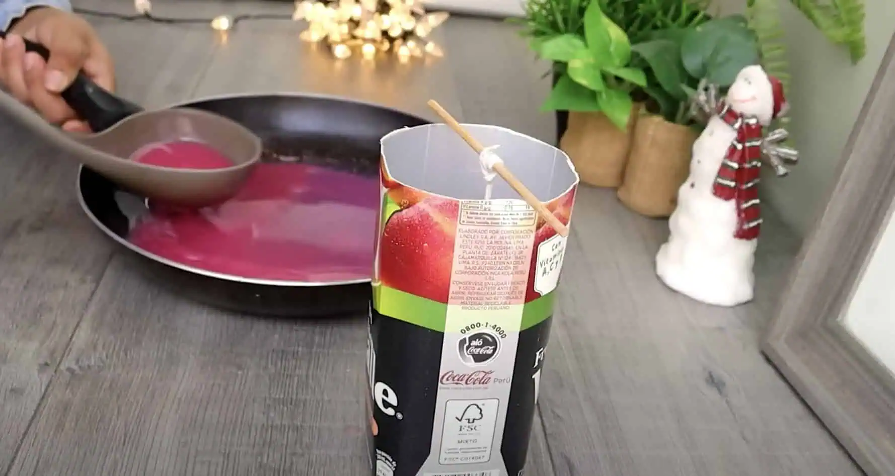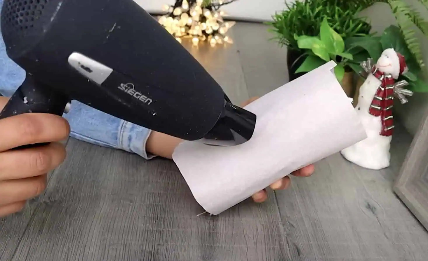 Teraz vezmeme fén, nasmerujeme ho na plochu s fotografiou a fúkame teplý vzduch, kým sa obrázok nestane súčasťou povrchu sviečky – nezataví sa do vosku.
