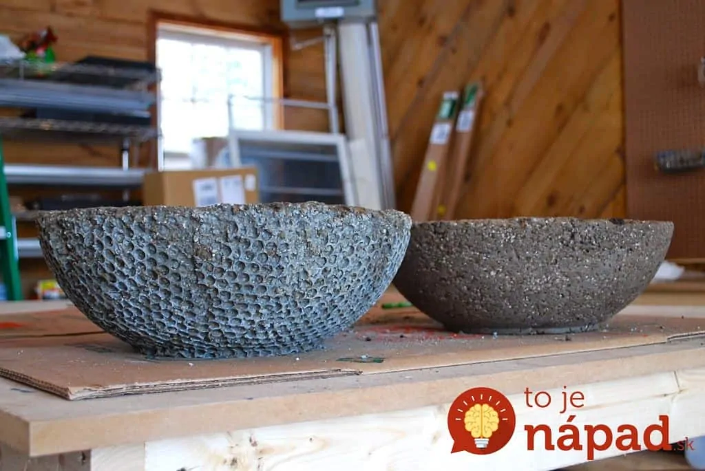 Ak chcete originálne betónové črepníky, vysteľte vnútro nádoby, do ktorej budete betón liať, bublinkovou fóliou. Okrem črepníkov môžete vytvoriť originálne svietidlo či misky.